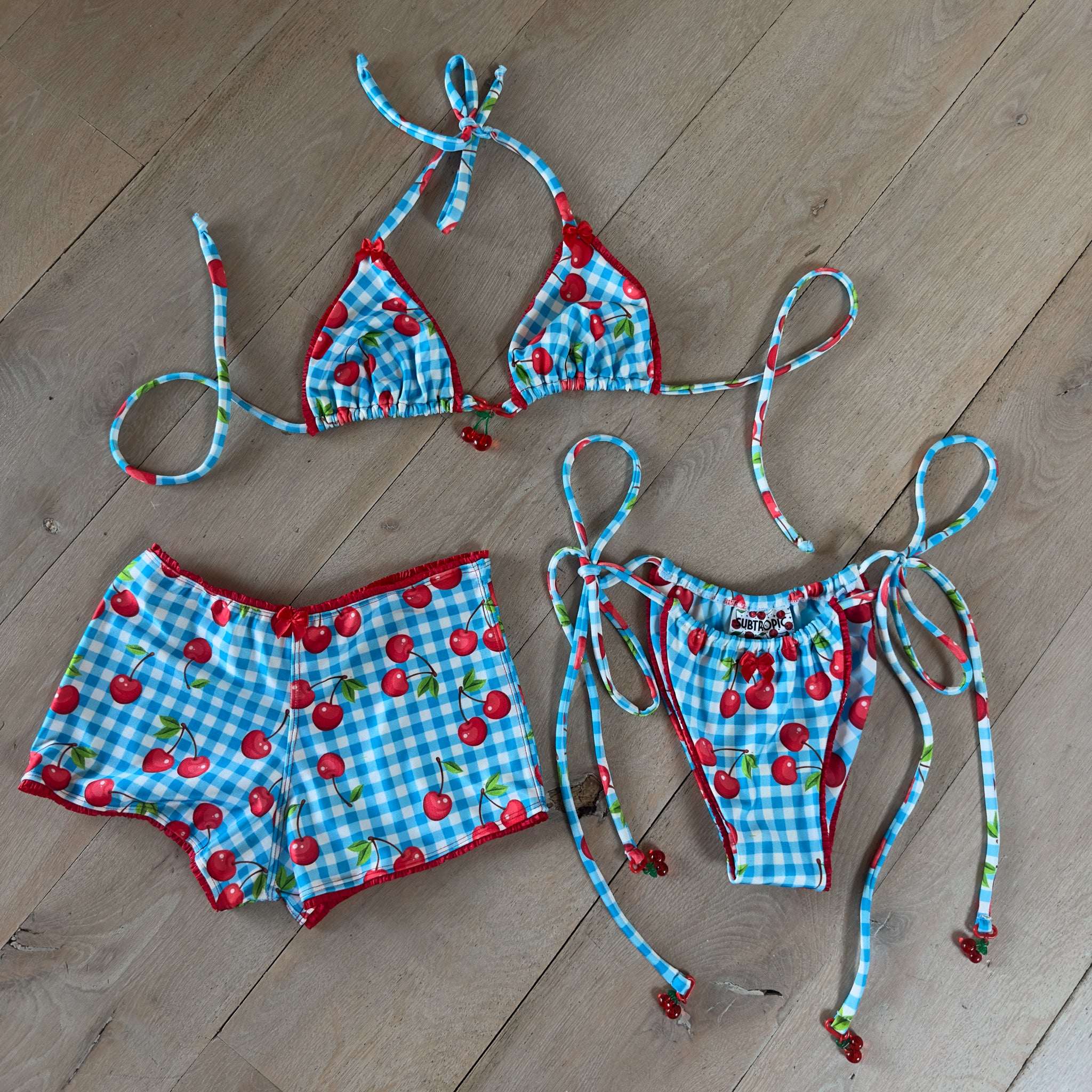 Note: This bikini is suitable for getting wet, but we recommend avoiding lengthy swims because of the delicate cherry charms.
