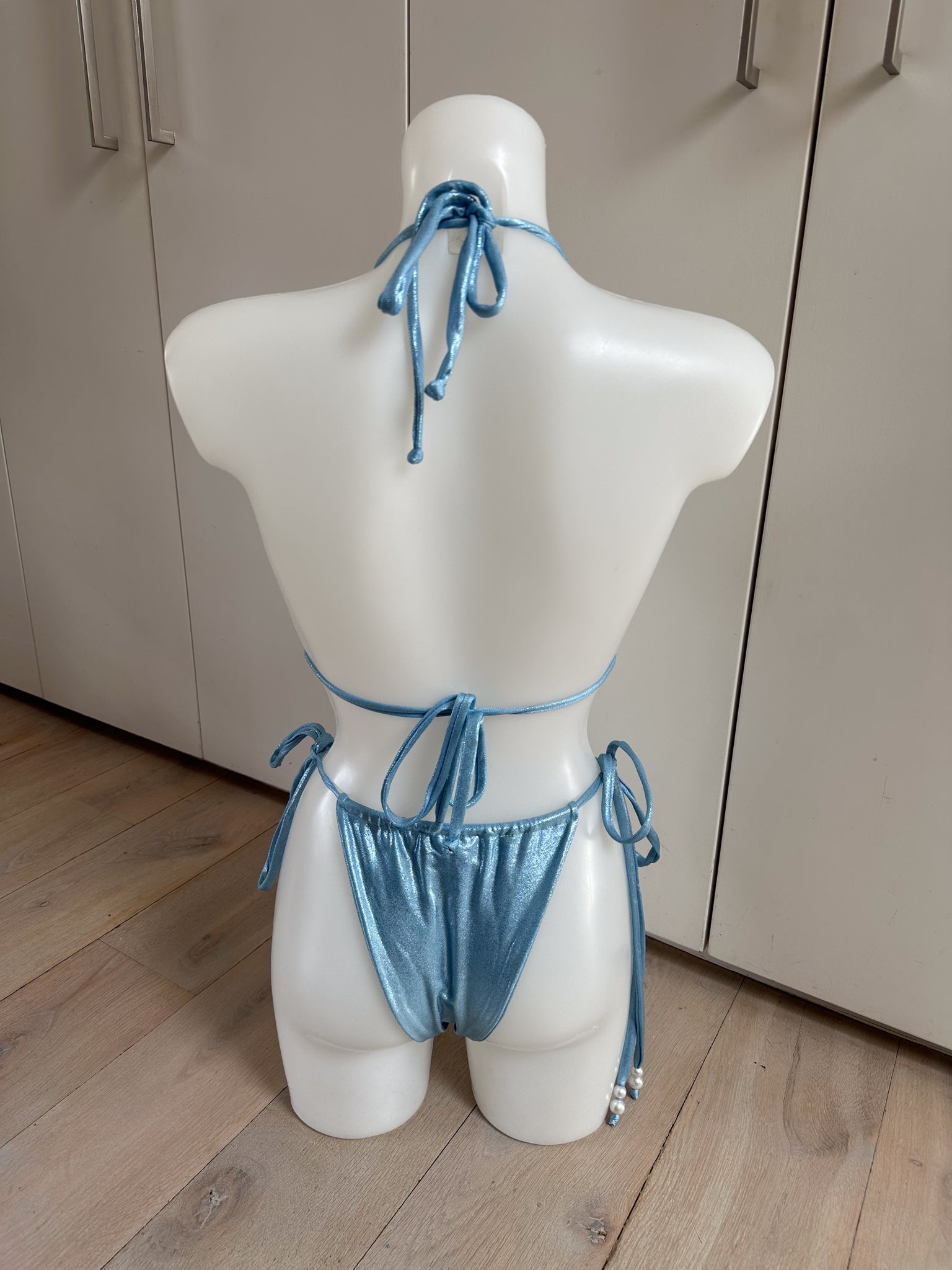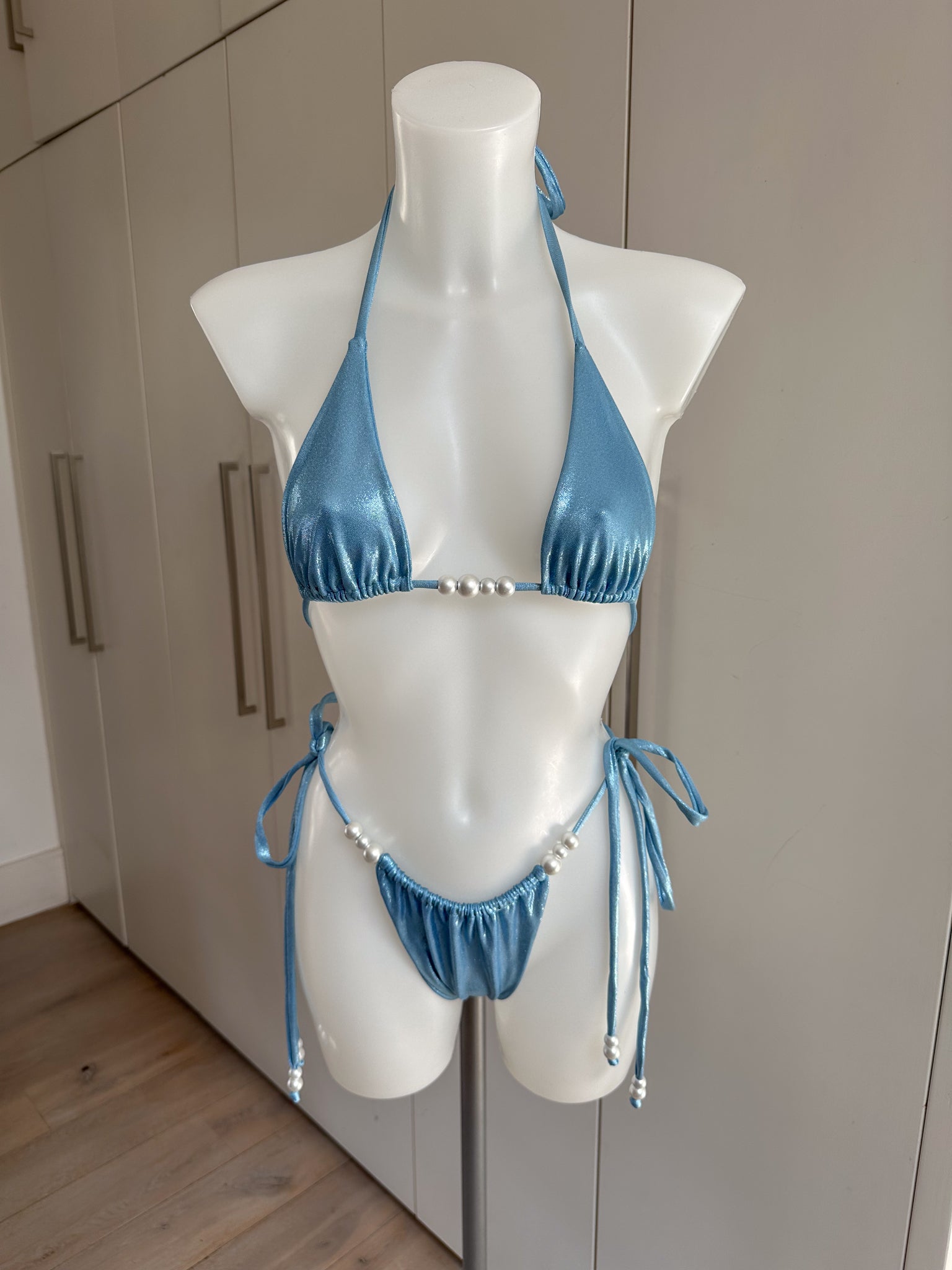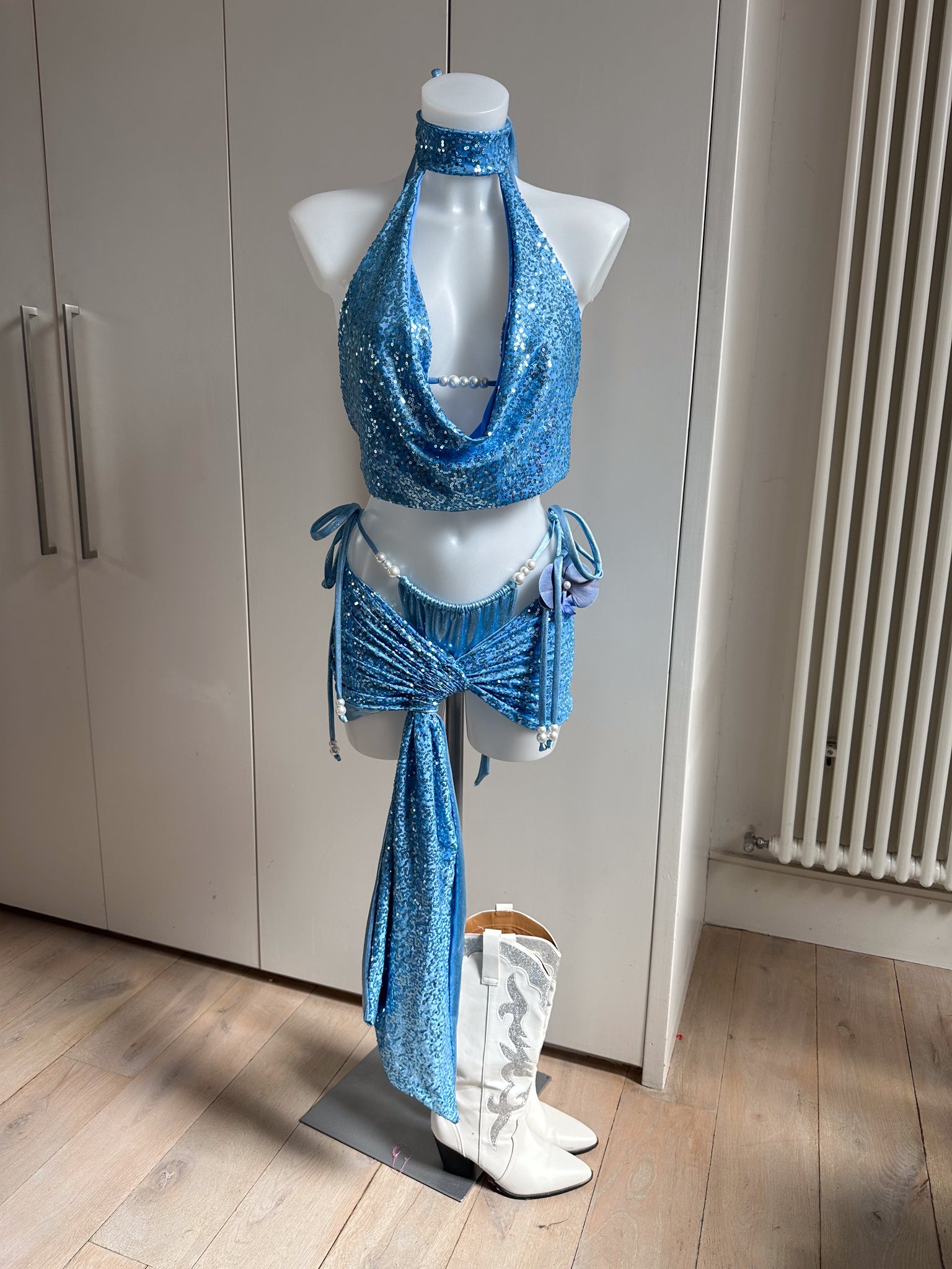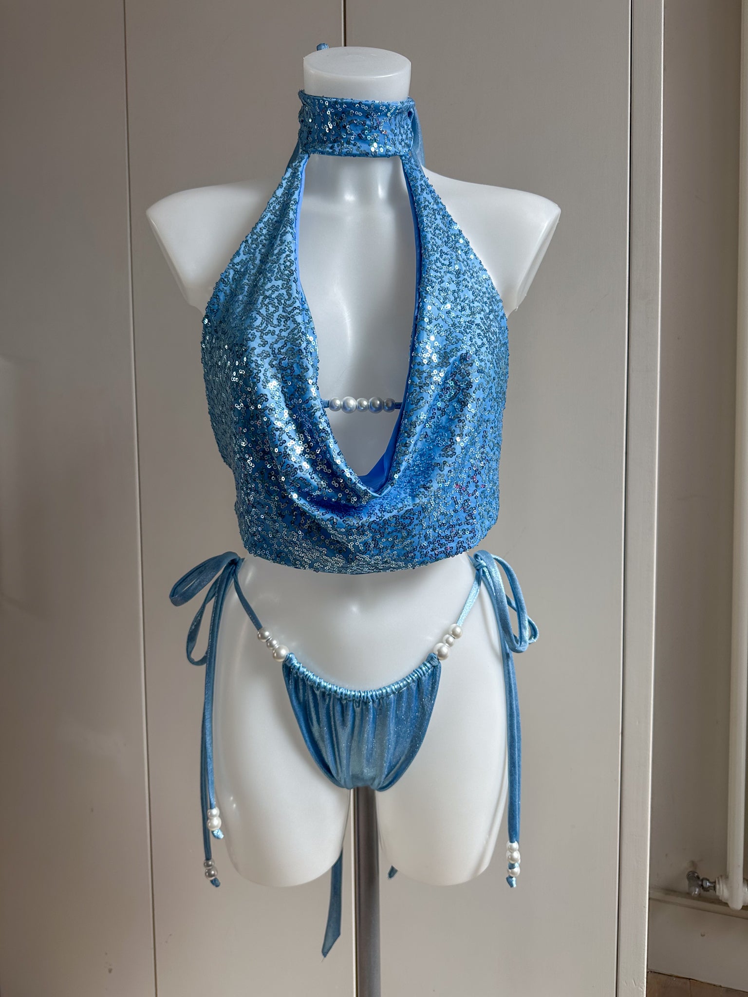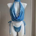 Powder Blue Bikini Set, Sequin Cowl Neck Top & Skirt