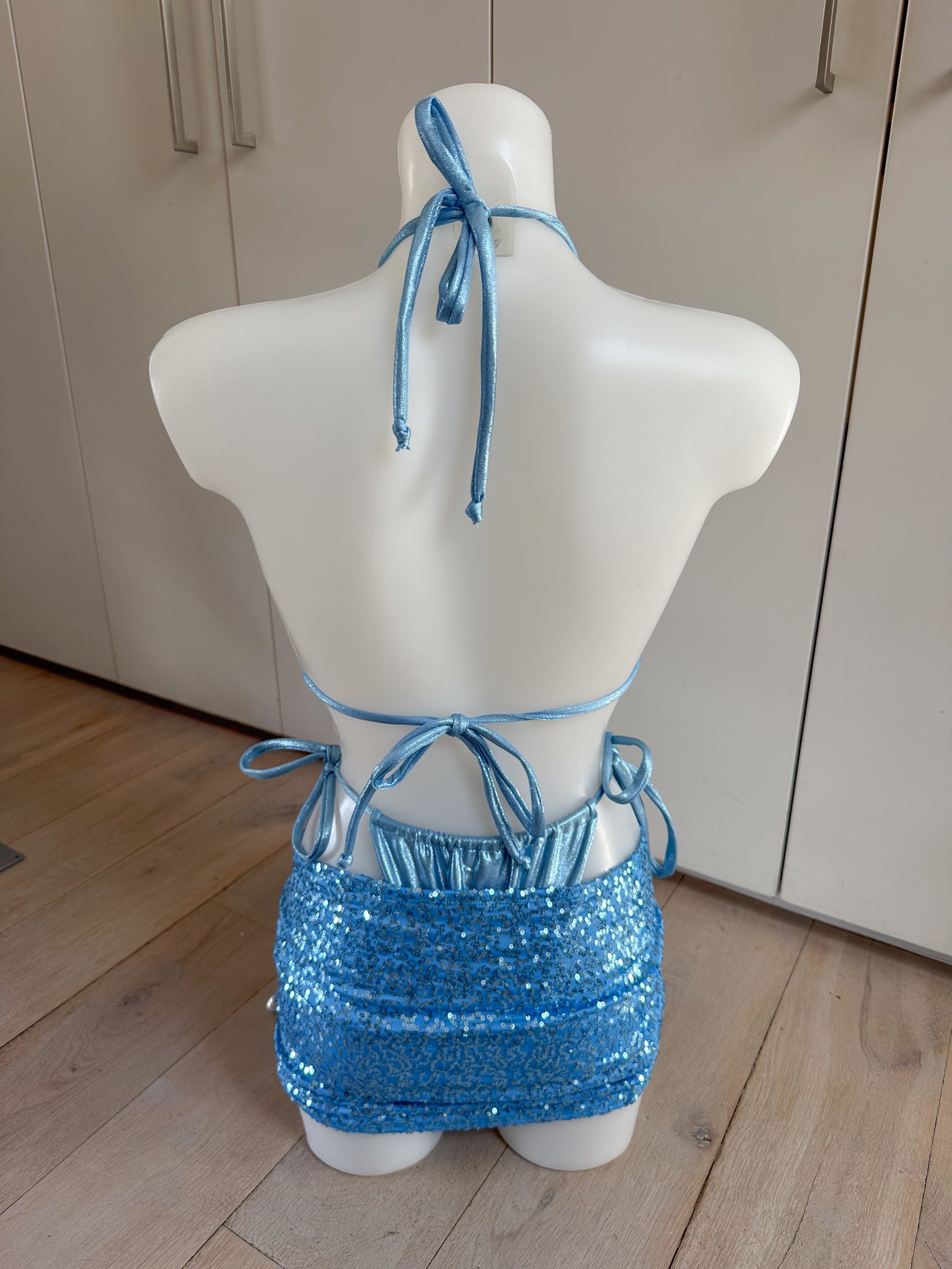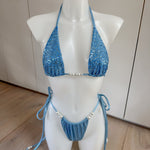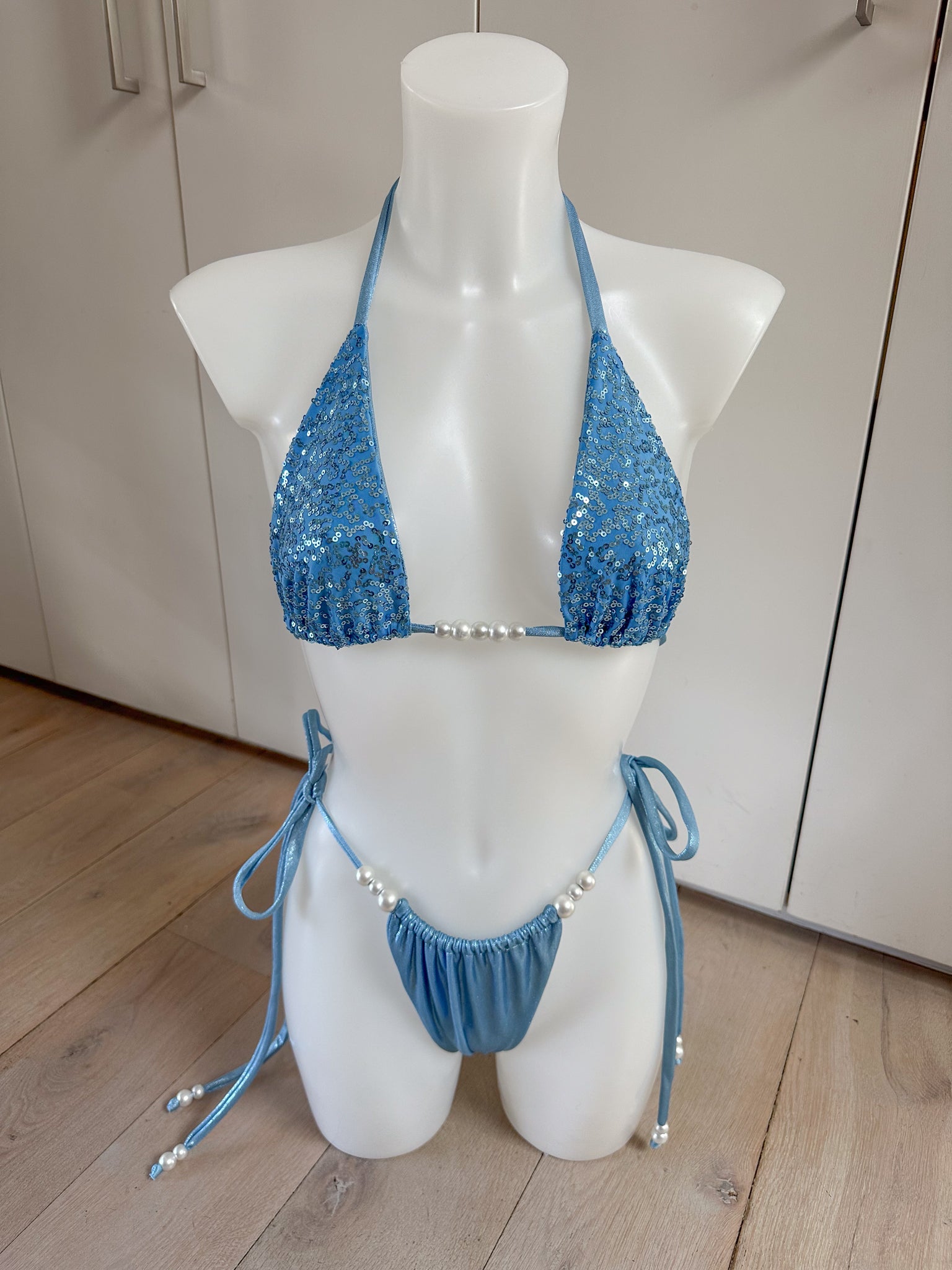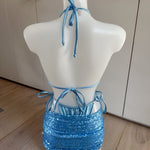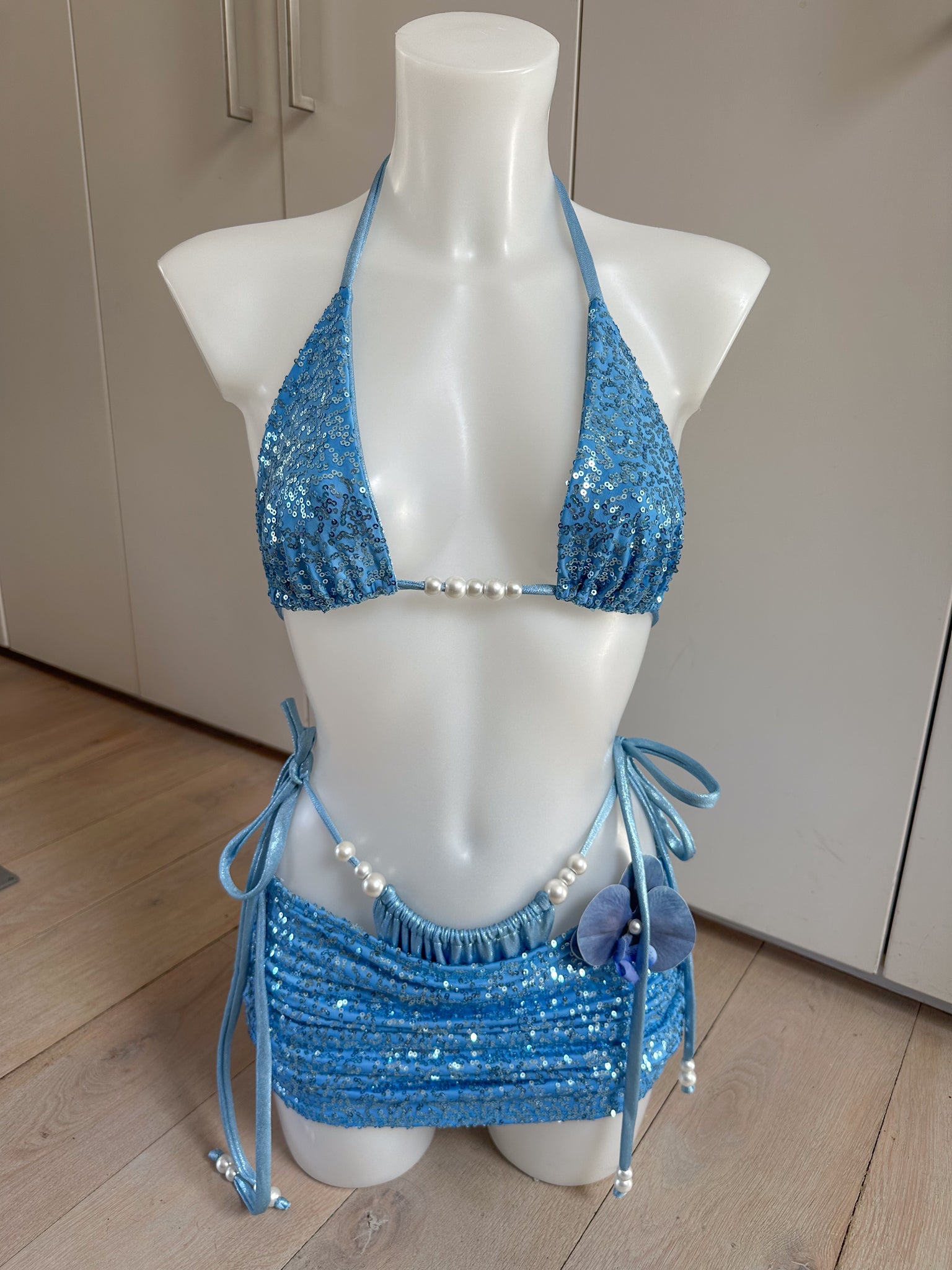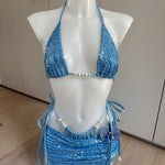 Live out your aquamarine fantasies with this dreamy blue bikini set and skirt. Featuring a flattering sequin bikini top and metallic bikini bottoms, and a sequin skirt, this set is beautifully finished with pearl bead details for an elegant, ocean-inspired touch.