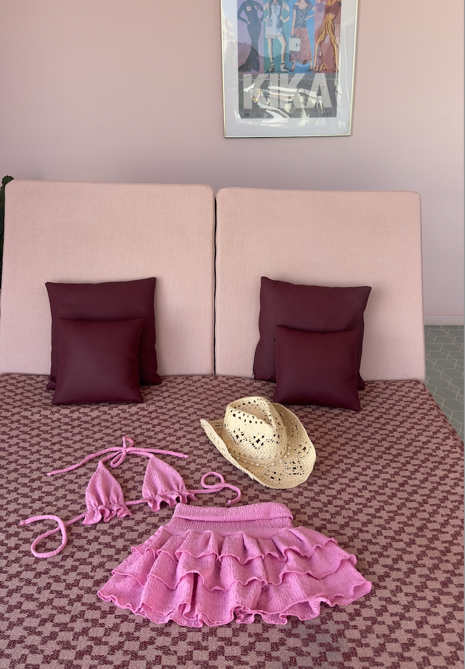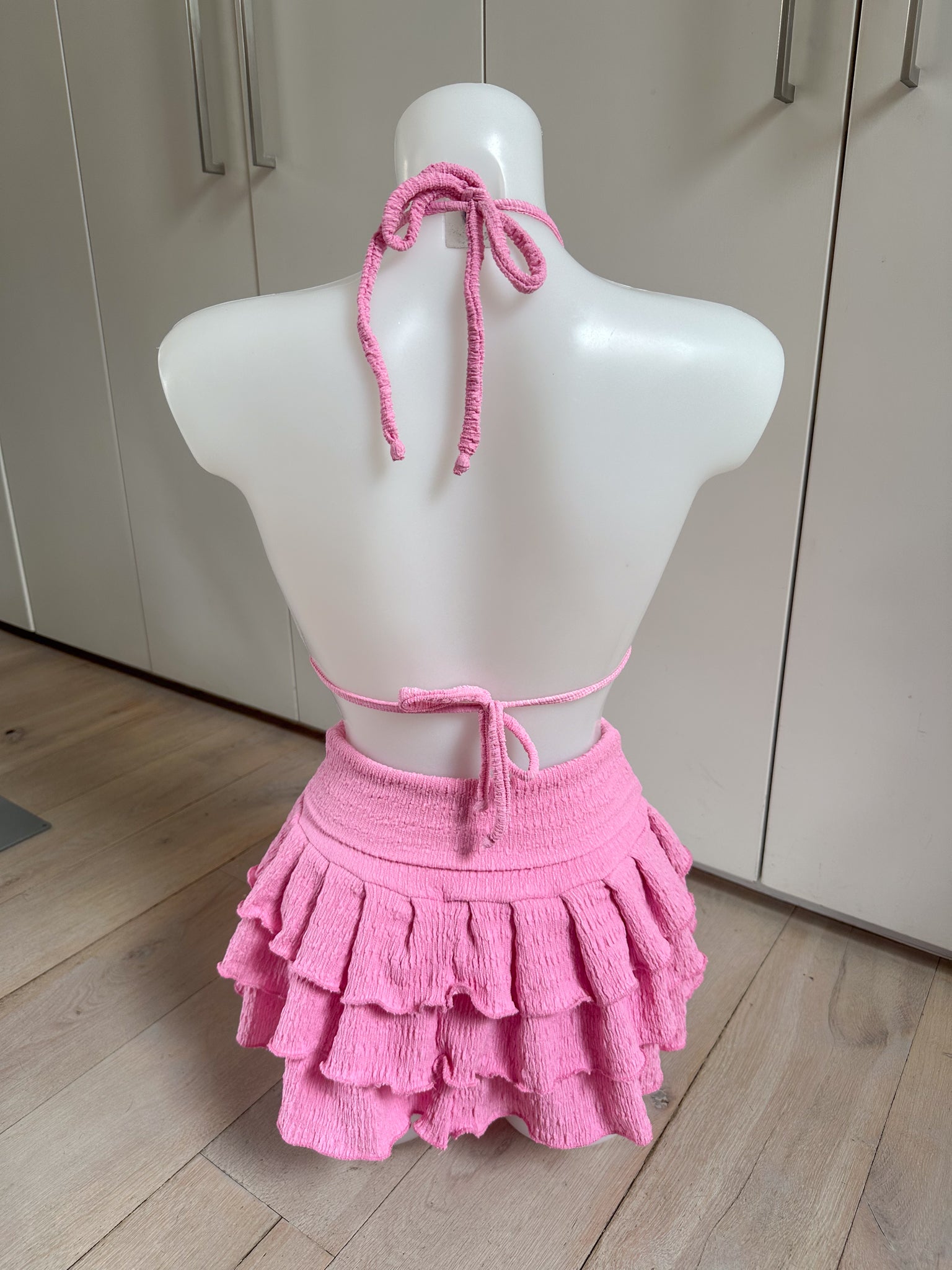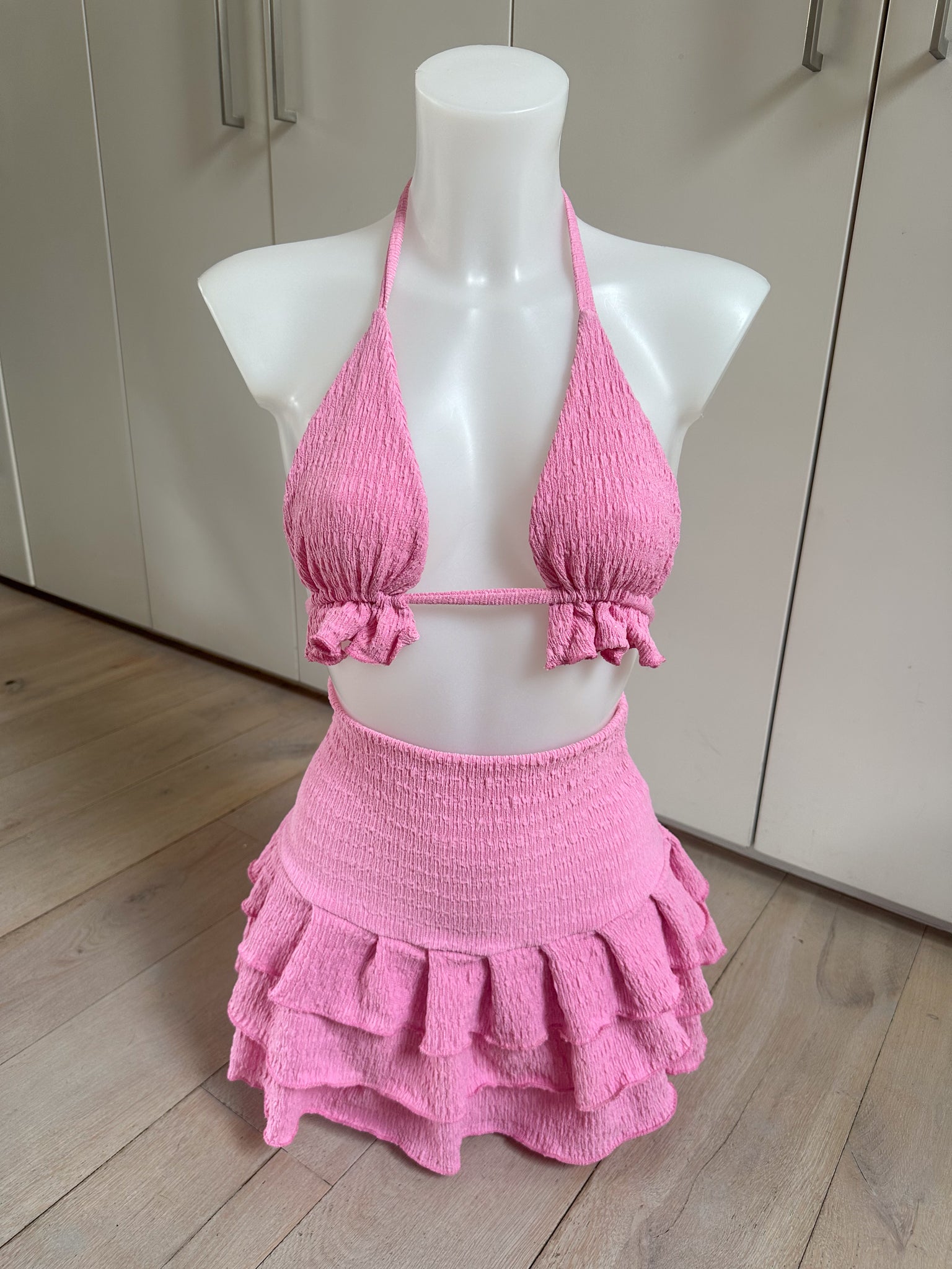 Turn heads in this stunning two-piece set, features a super unique popcorn textured stretch knit fabric. It's super soft and stretchy for ultimate comfort. A triple-layered rara skirt and adjustable bralet are designed for both style and versatility.