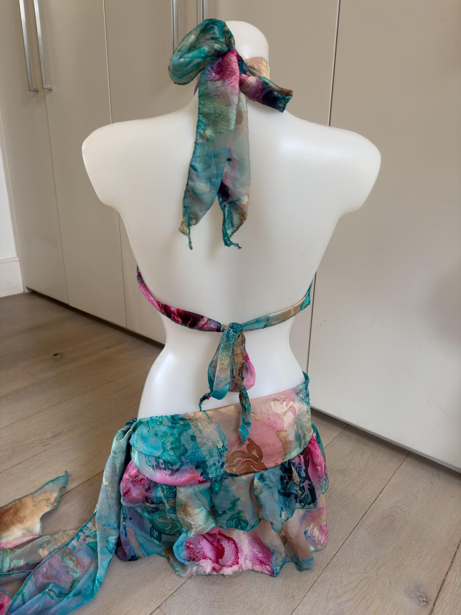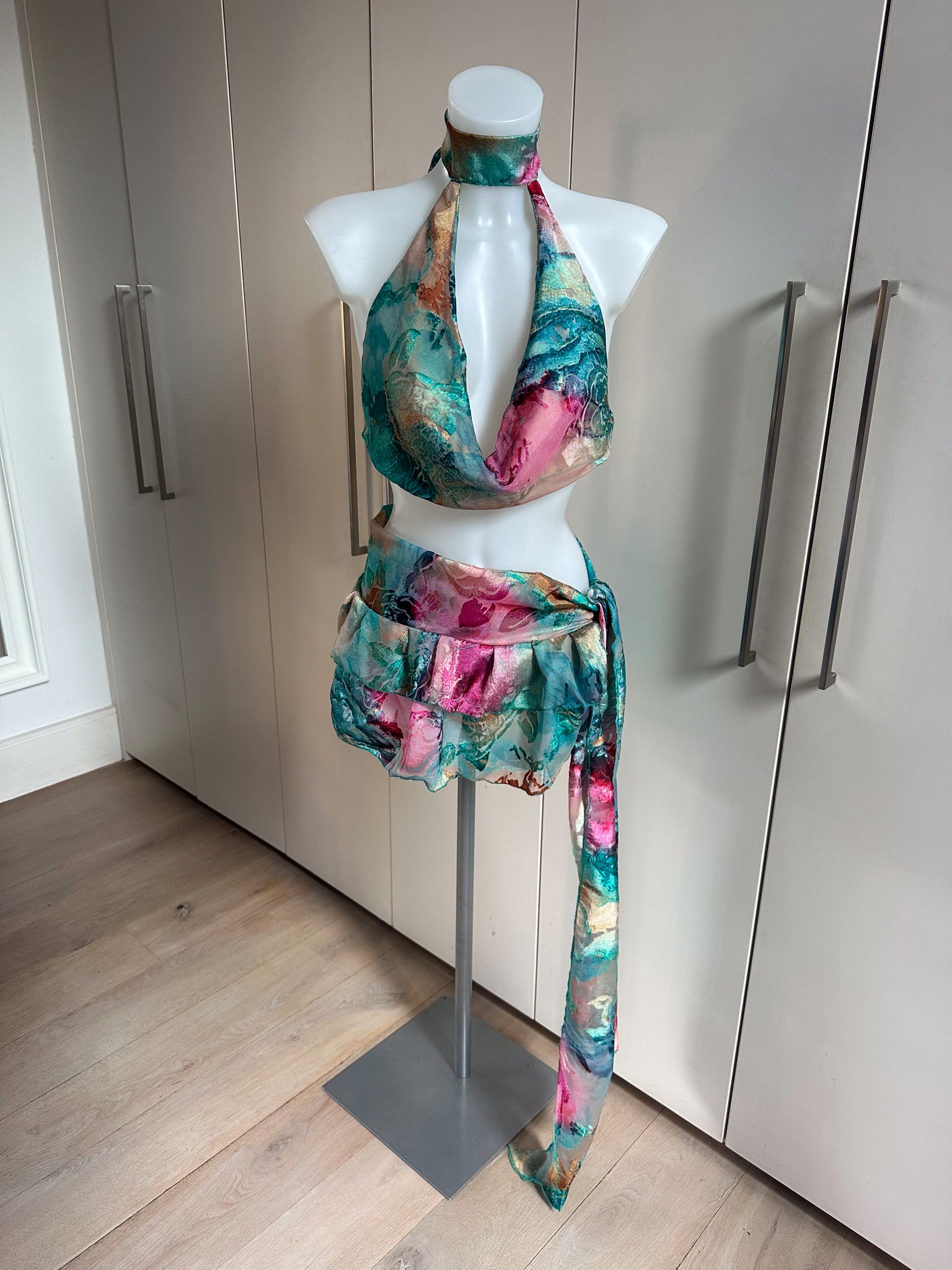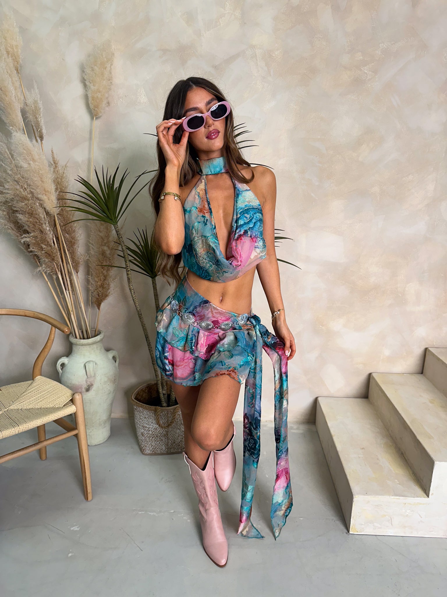 Bohemian but make it subtropic. This listing Includes a colourful water colour print chiffon cowl neck top and side tie skirt.