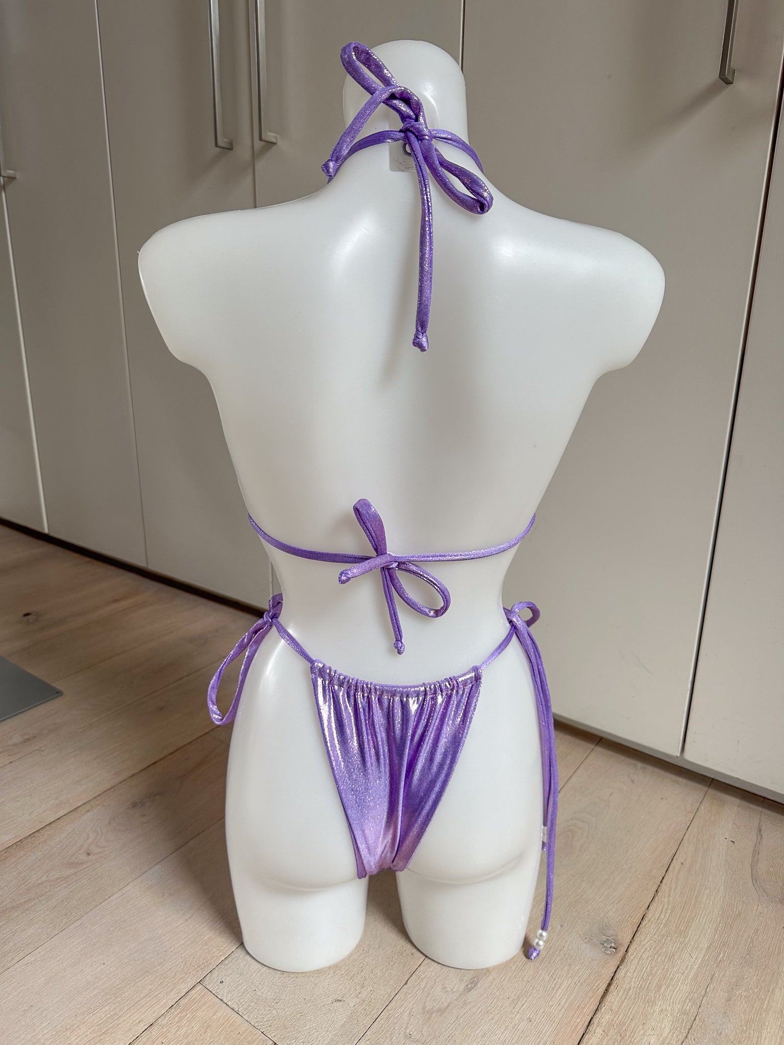 Live out your mermaid fantasies with this dreamy lilac bikini set. Featuring a flattering sequin bikini top and metallic bikini bottoms, this set is beautifully finished with pearl bead details for an elegant, ocean-inspired touch.