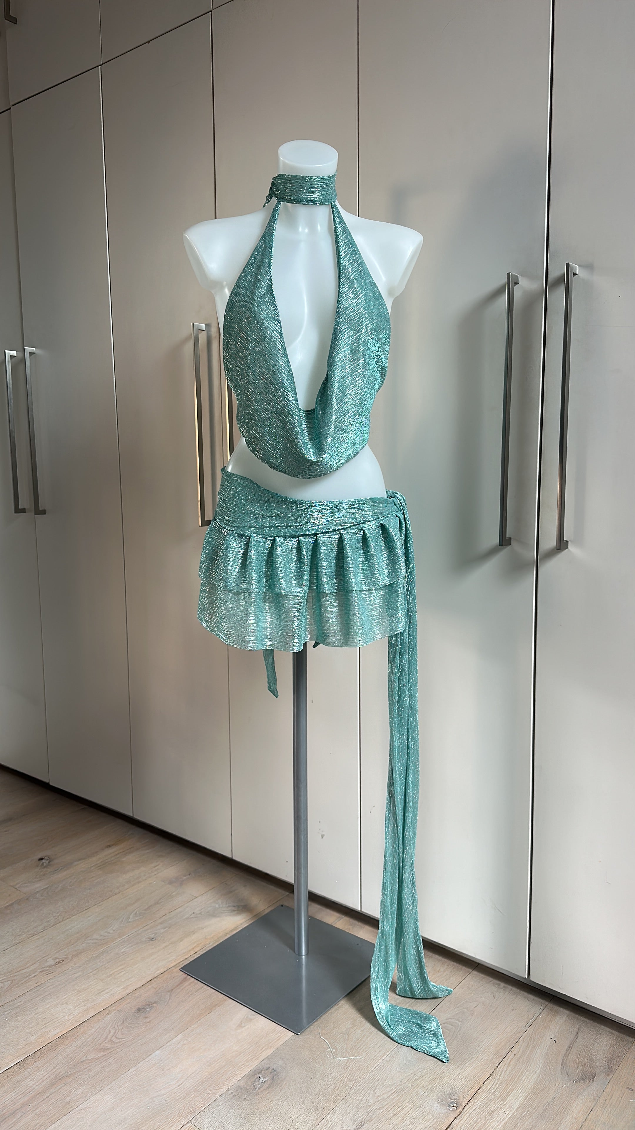 Metallic Mint Sheer Cowl Neck Top & Skirt