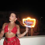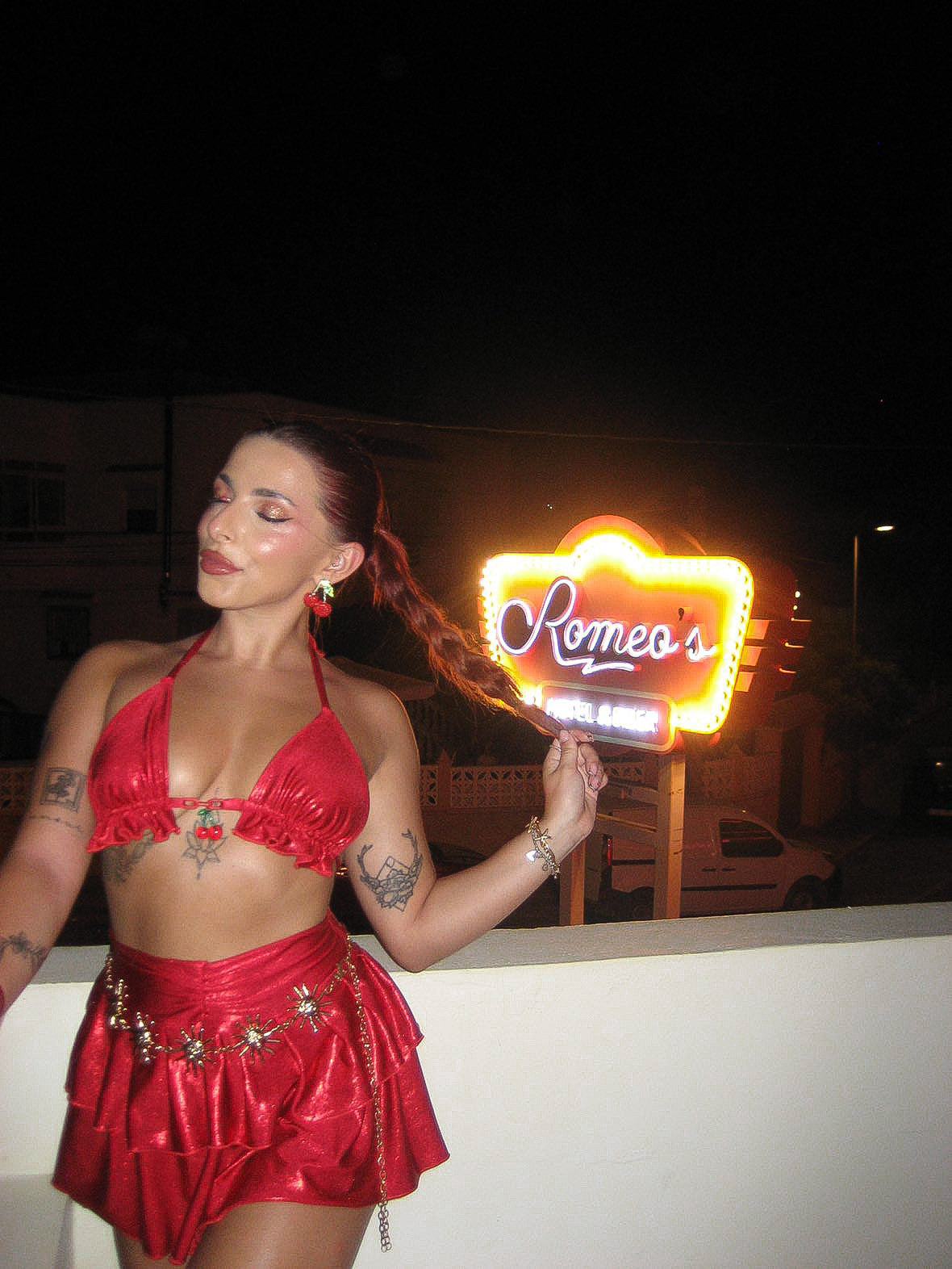 Turn heads in this stunning two-piece set, crafted from premium metallic red fabric. Perfect for poolside parties or a club night out, the unique double-layered skirt and adjustable bralet are designed for both style and versatility.