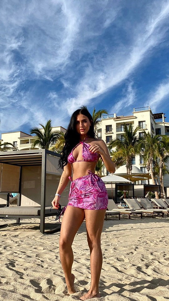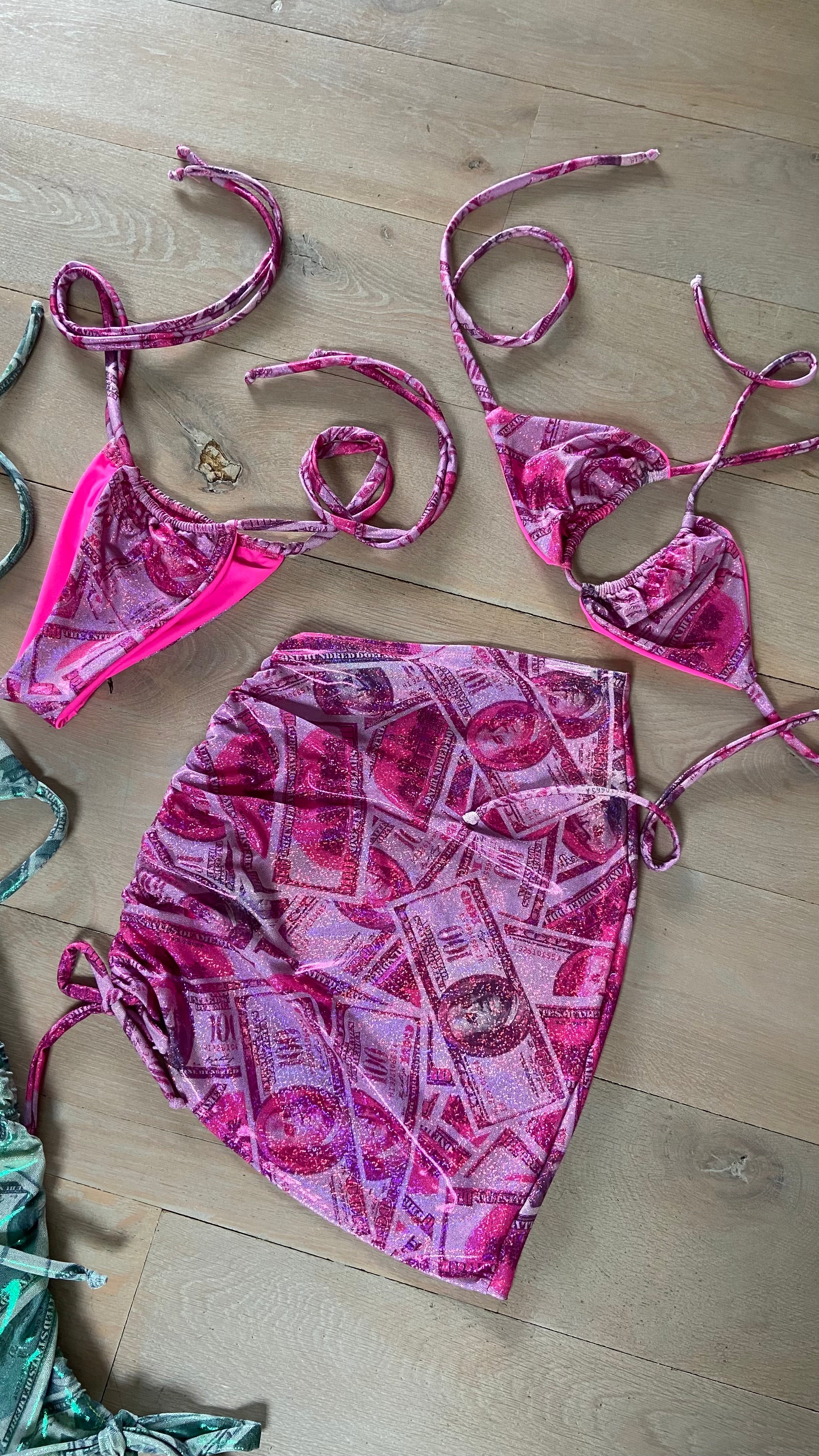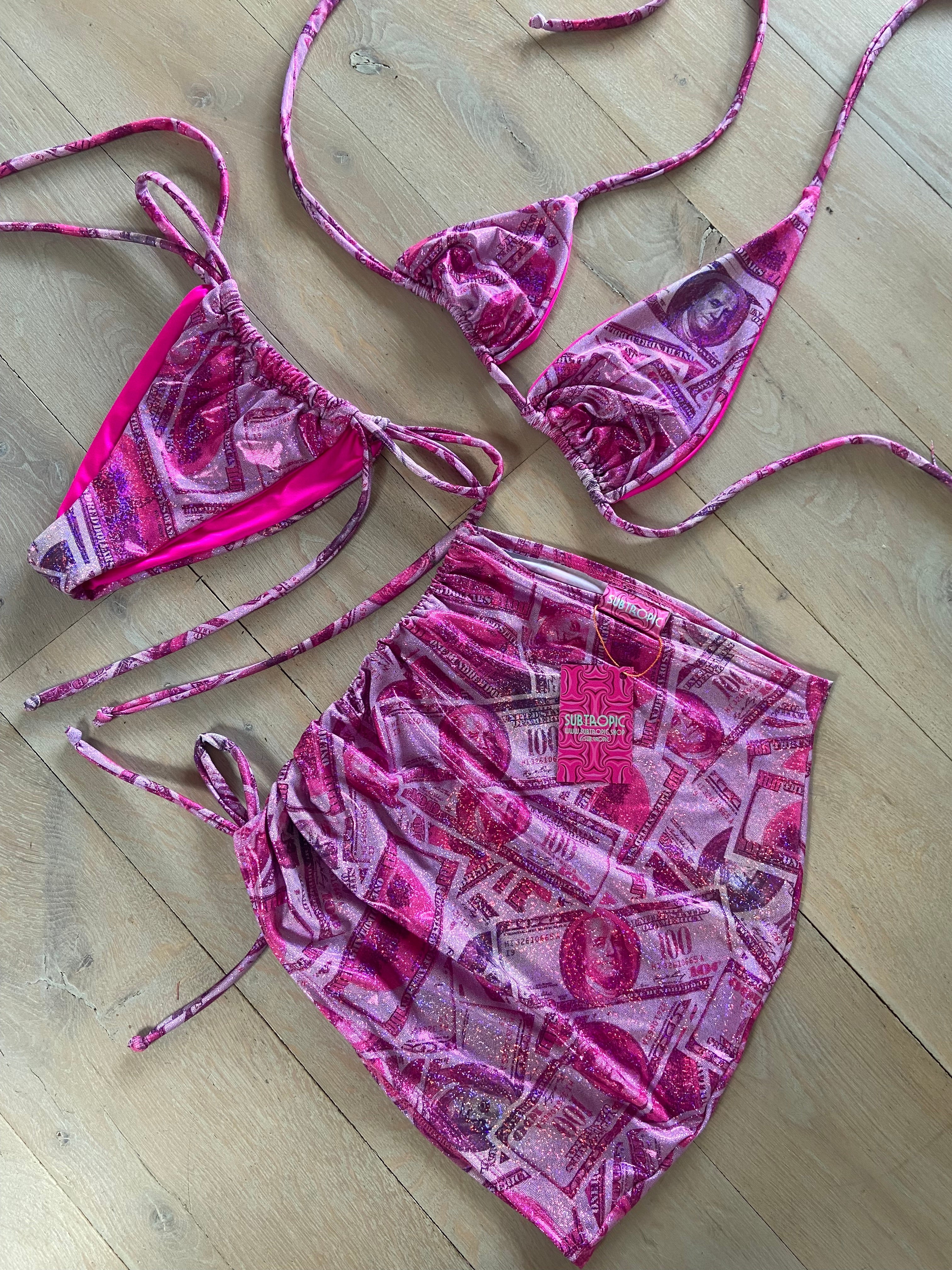 Asymmetric Bralet, Bikini Bottoms & Skirt - Pink Metallic Money