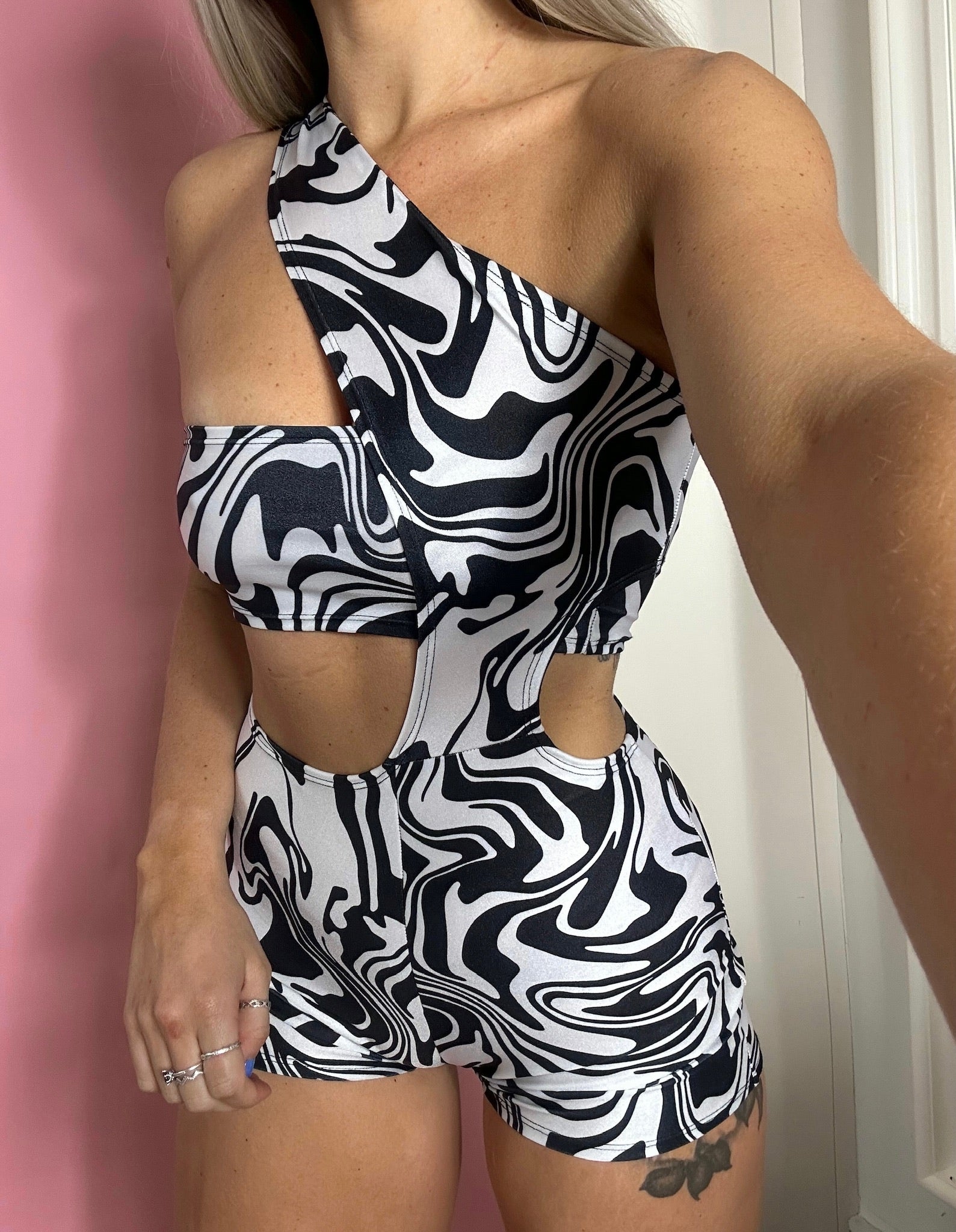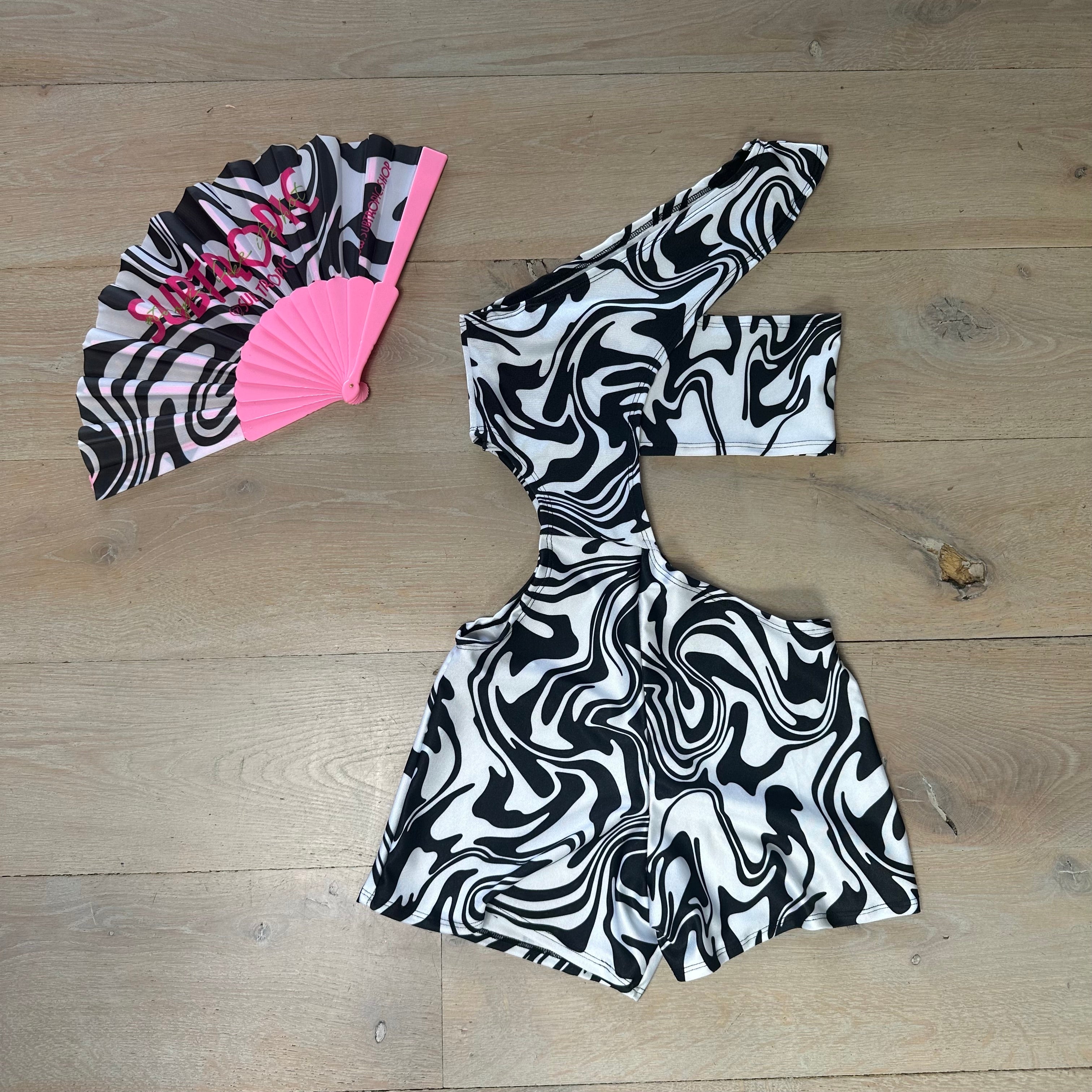 Monochromatic psychedelic swirl print with a pop of colour - pair with the matching Denk Mode Elle cowboy hat (sold separately)