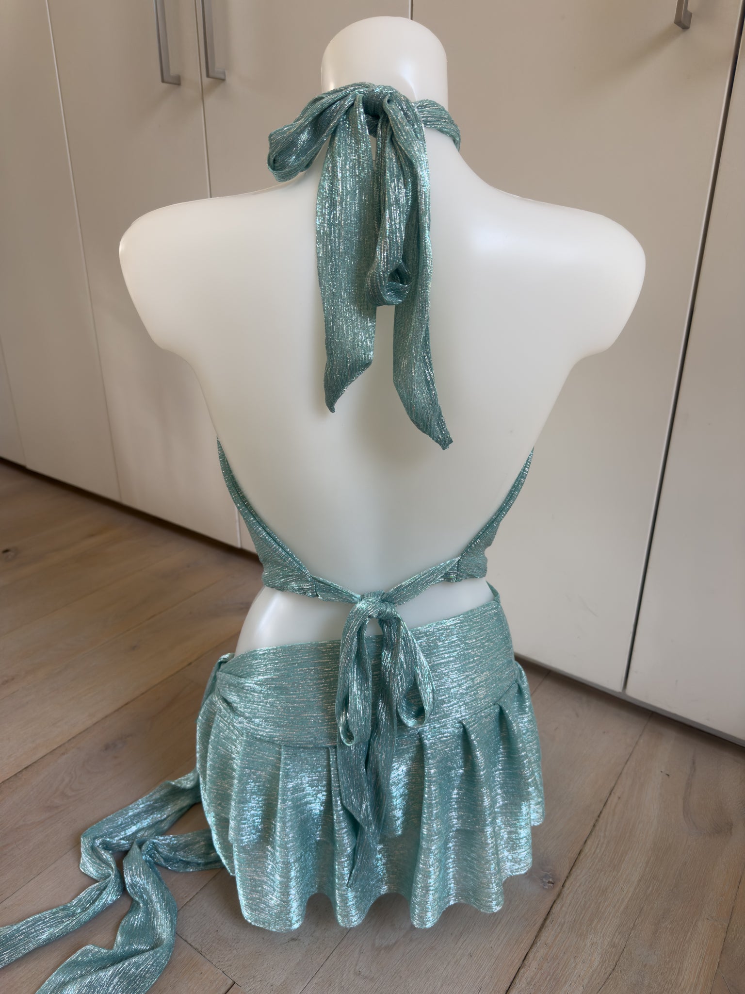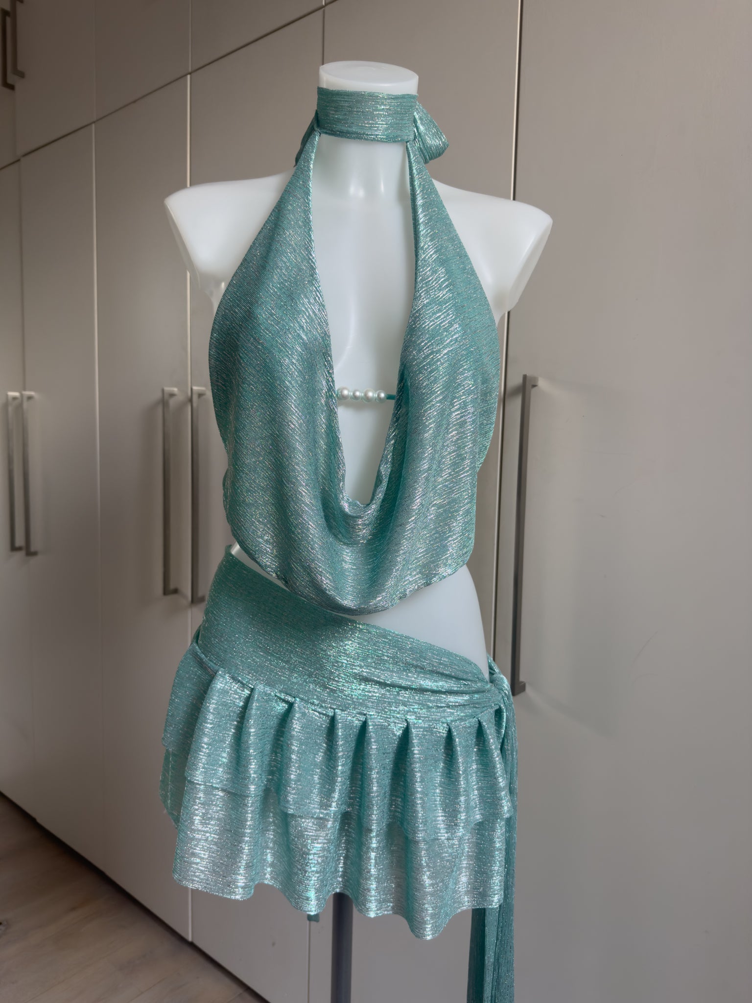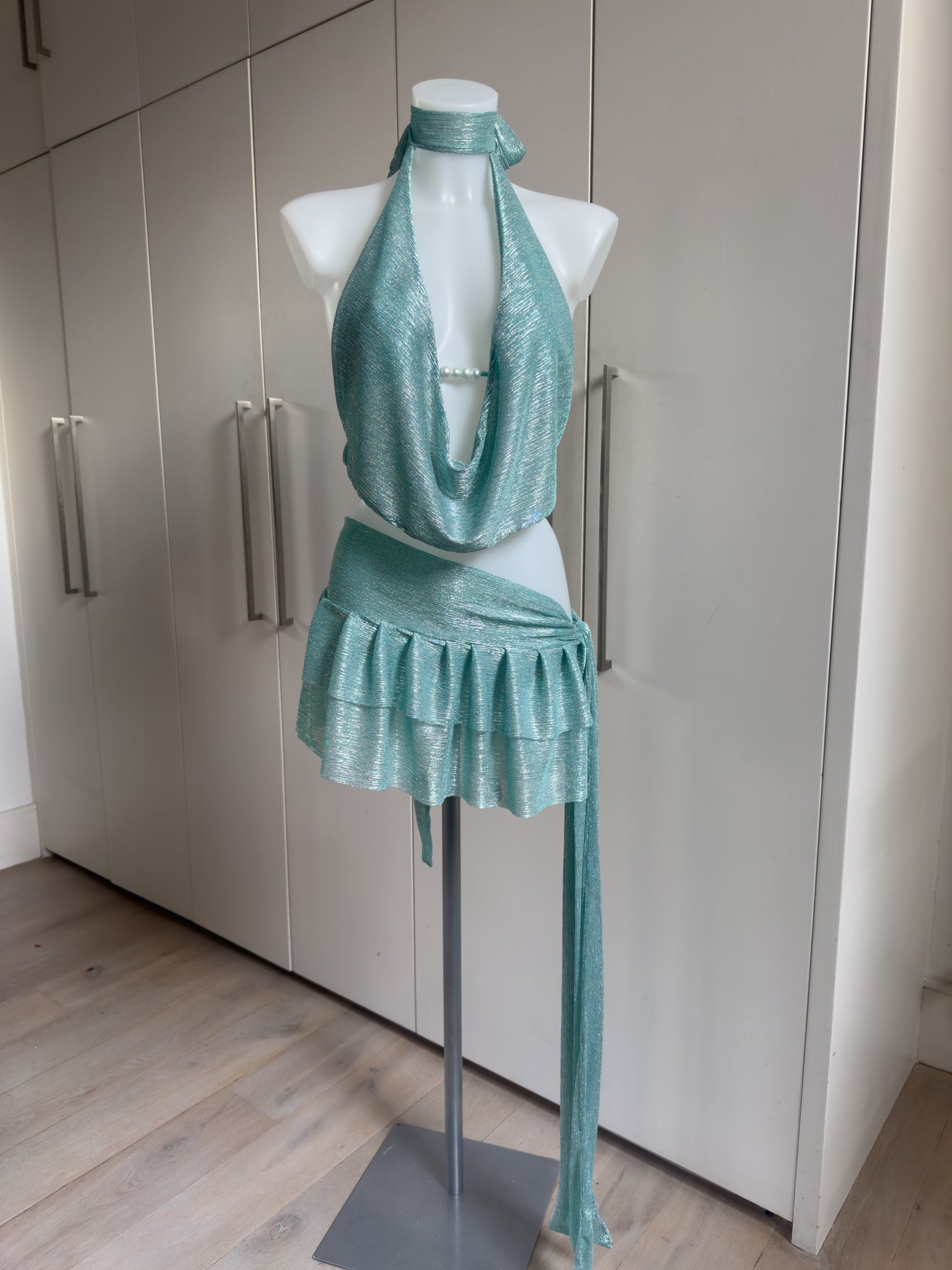 Pearl Beaded Mint Bikini top, Metallic Mint Sheer Cowl Neck Top & Skirt - Bundle Deal