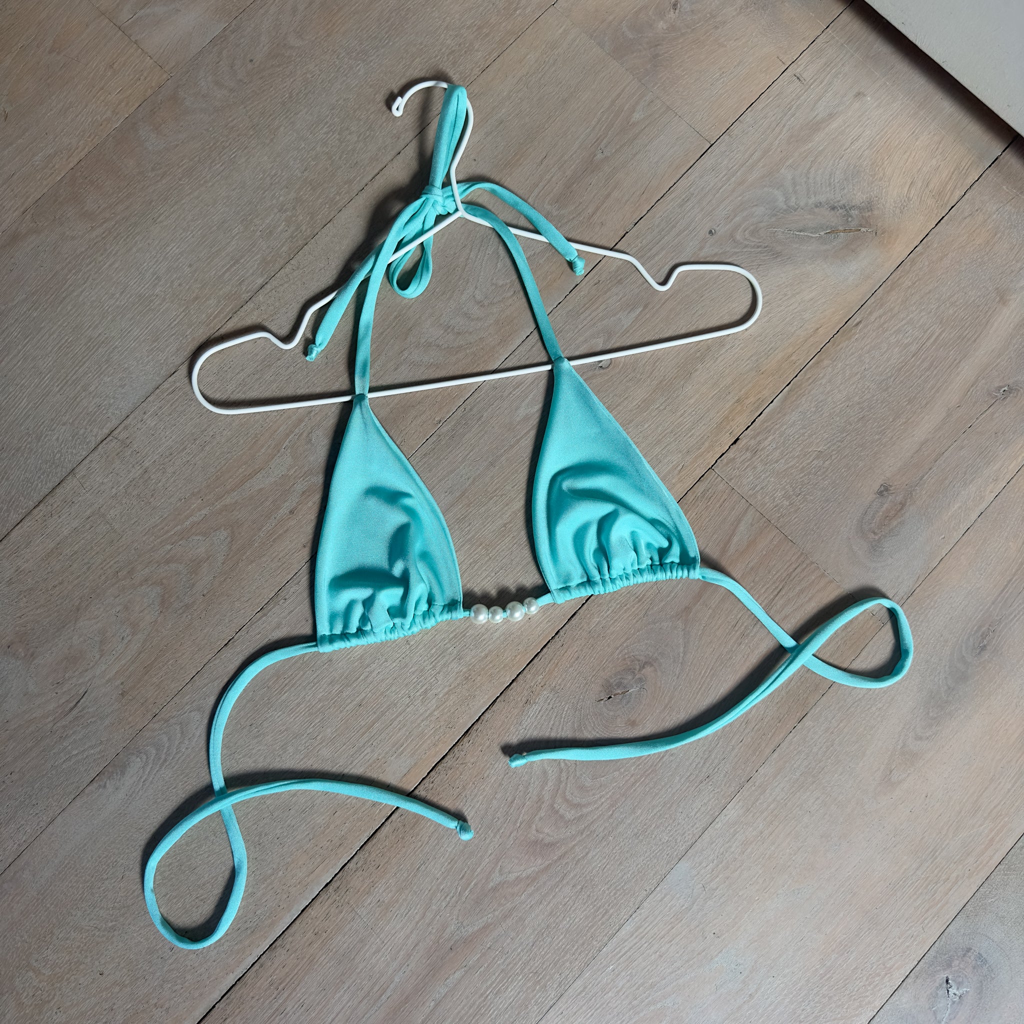 Live out your mermaid fantasies with this set which Includes a bikini top finished with pearl bead details paired with a sheer mint metallic co ord set.