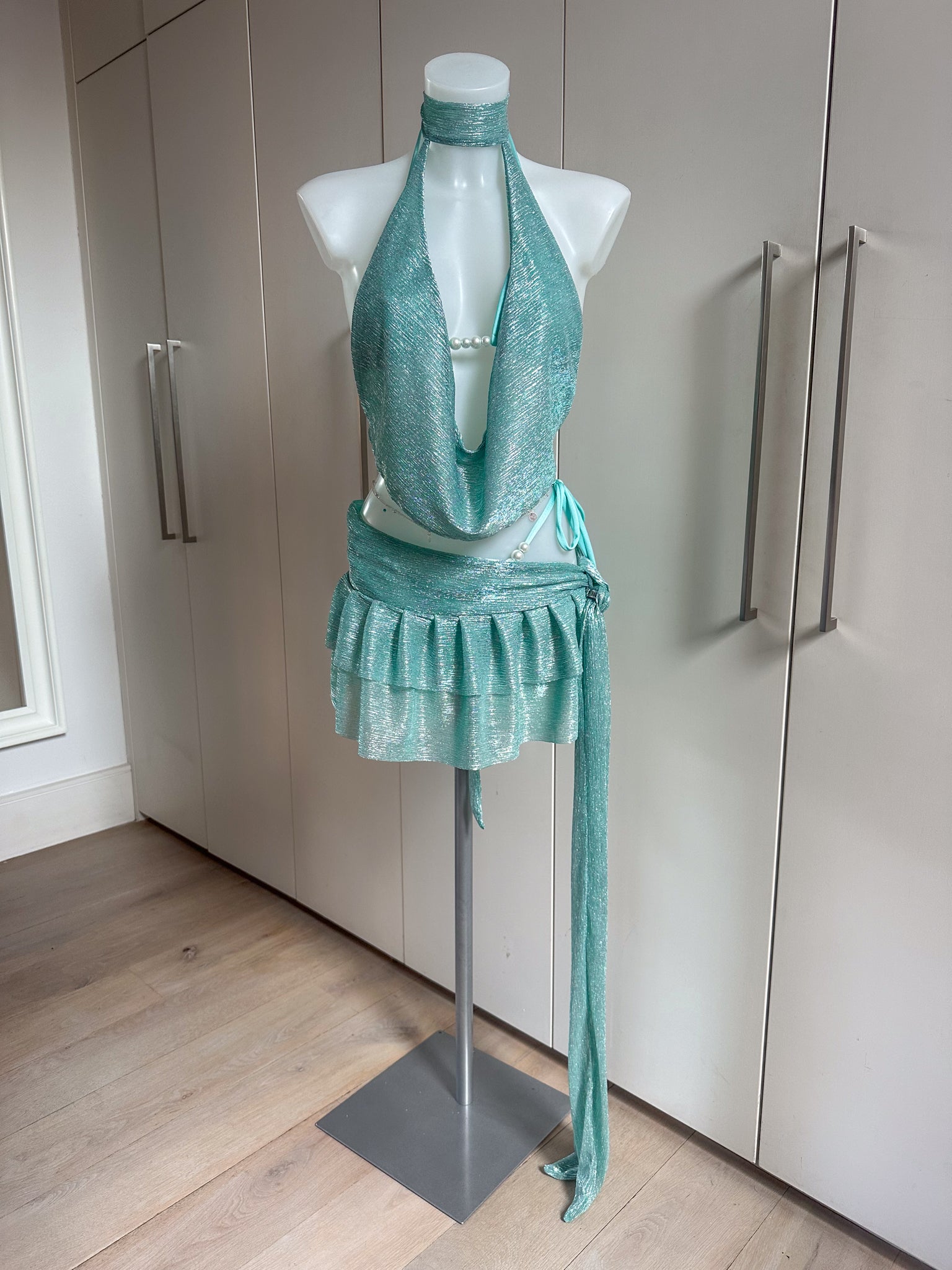 Pearl Beaded Mint Bikini Set, Metallic Mint Sheer Cowl Neck Top & Skirt - Bundle Deal