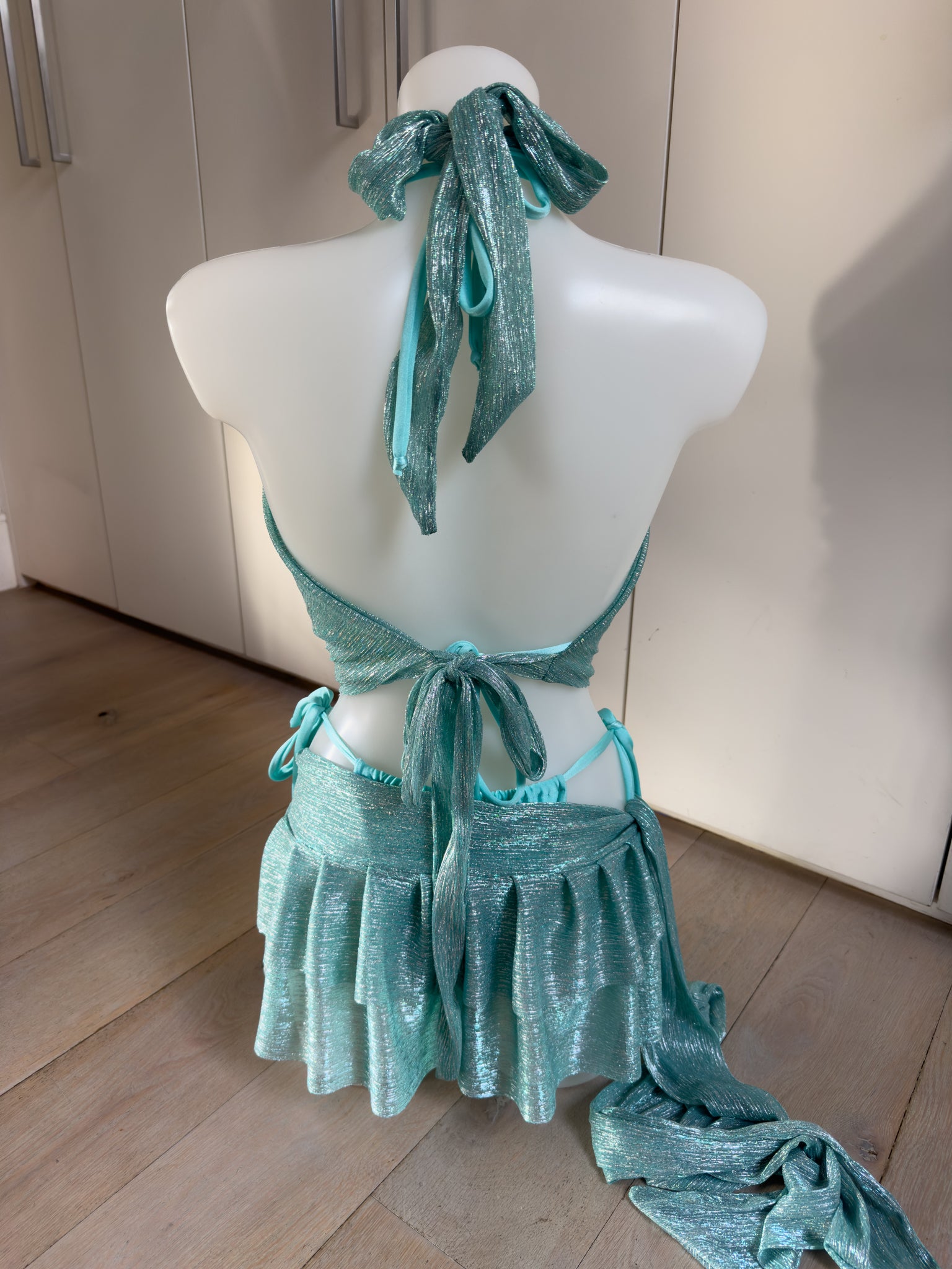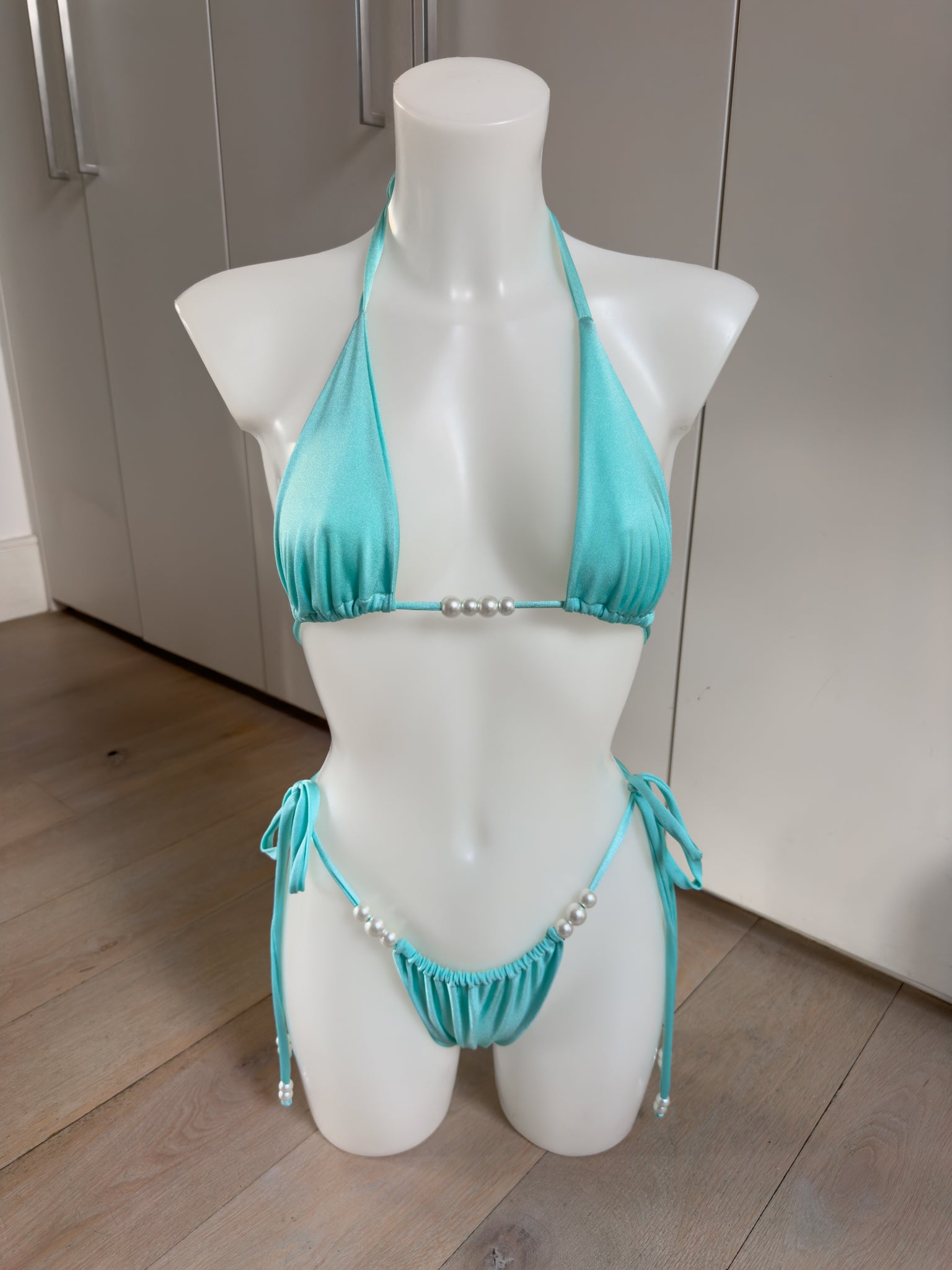 Live out your mermaid fantasies with this set which Includes a bikini top, cheeky bikini bottoms finished with pearl bead details paired with a sheer mint metallic co ord set.
