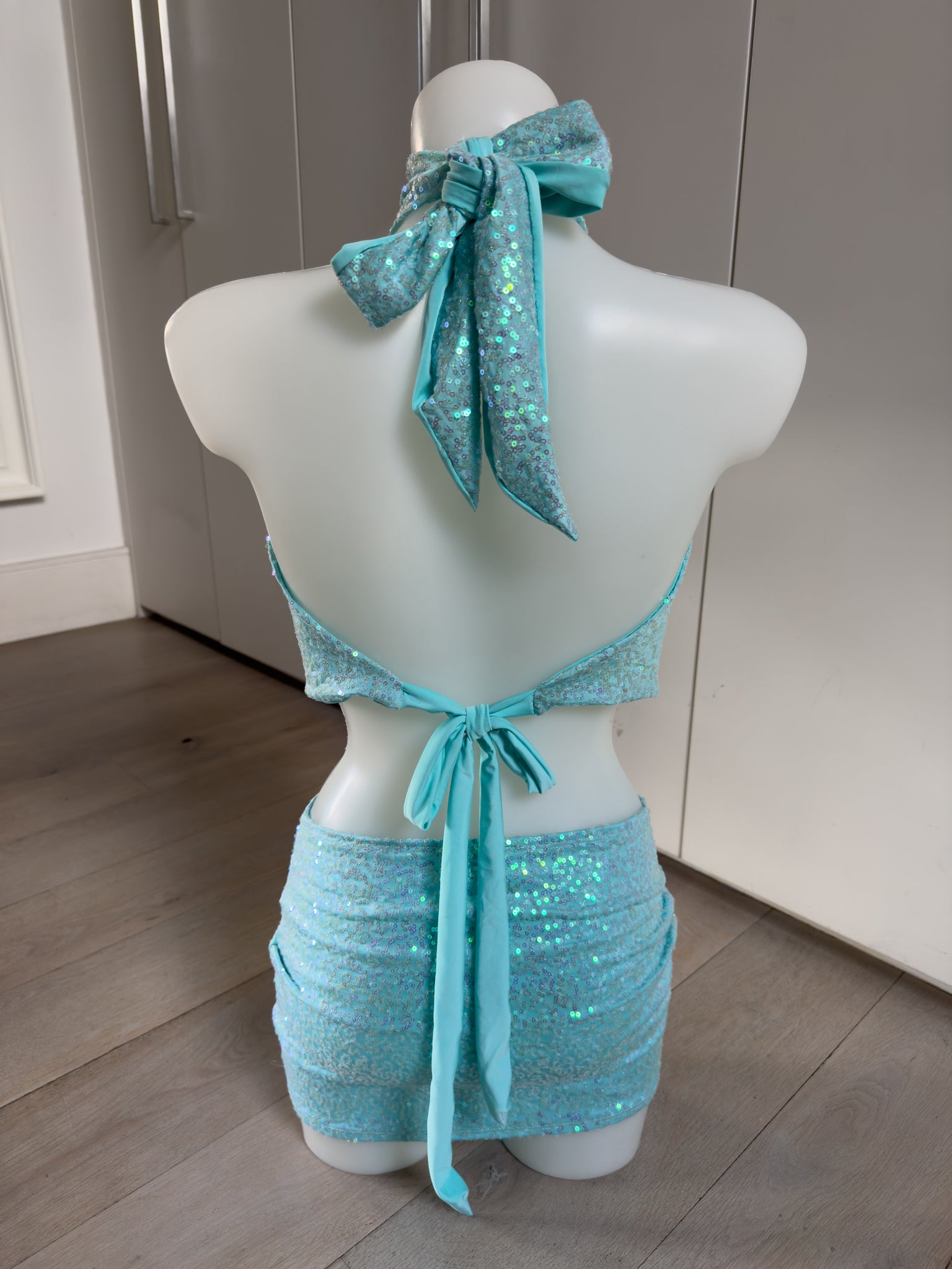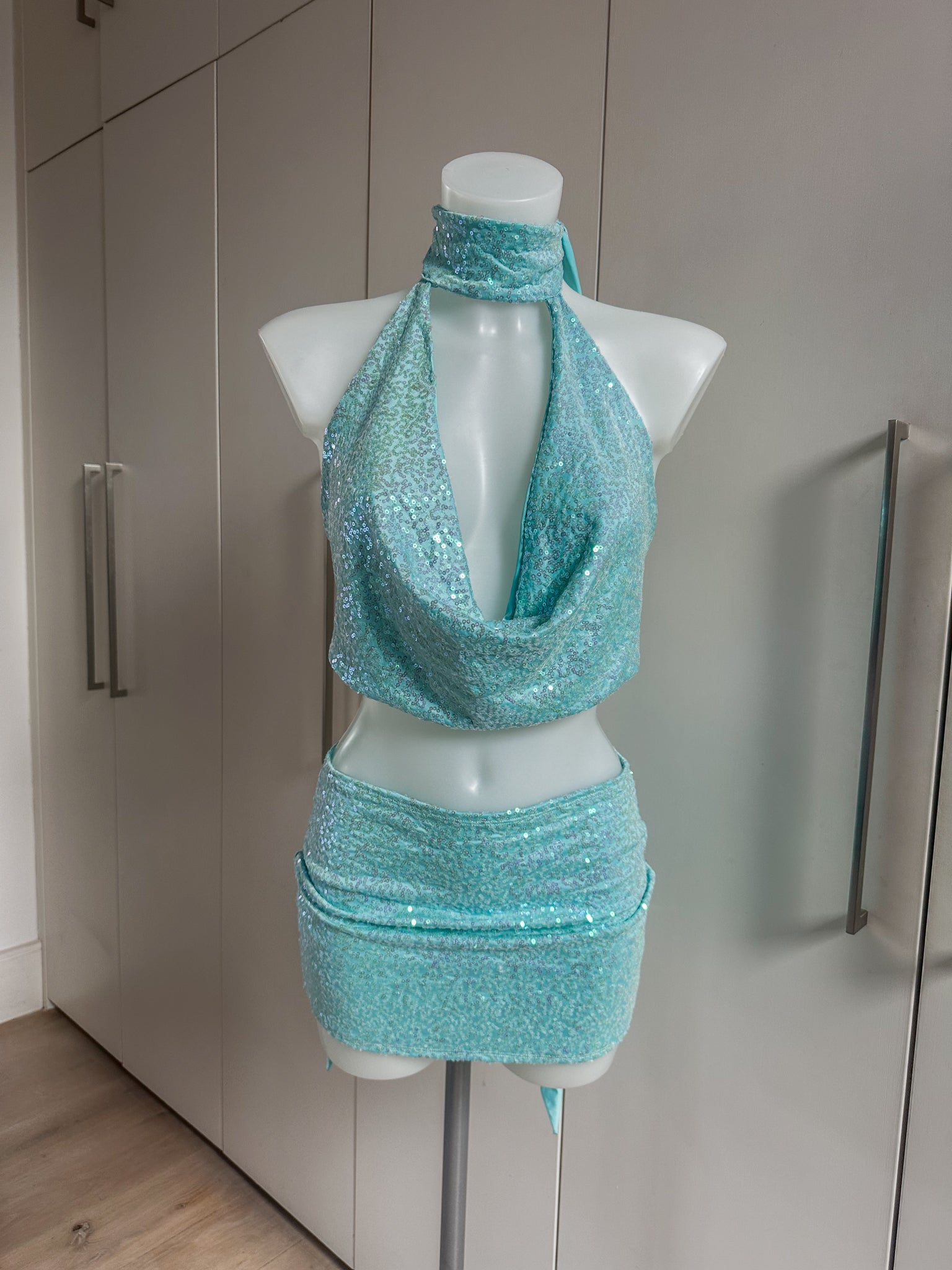 Living out all your ibiza aquamarine fantasies with this sequin mint co ord. Includes a sequin cowl neck top & skirt.