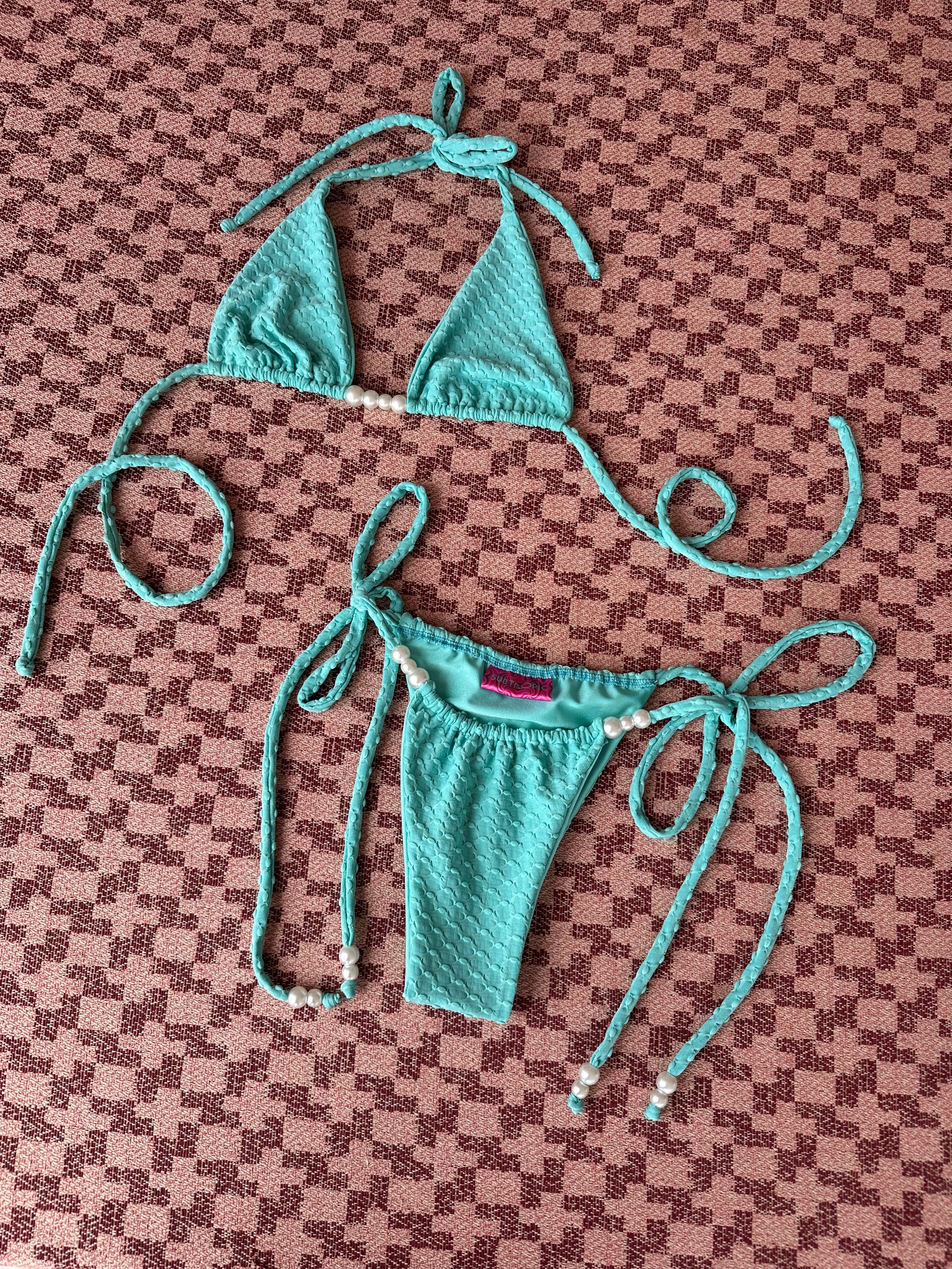 Elevate your look with this turquoise, unique textured, super soft and stretchy bikini set with pearl bead details.