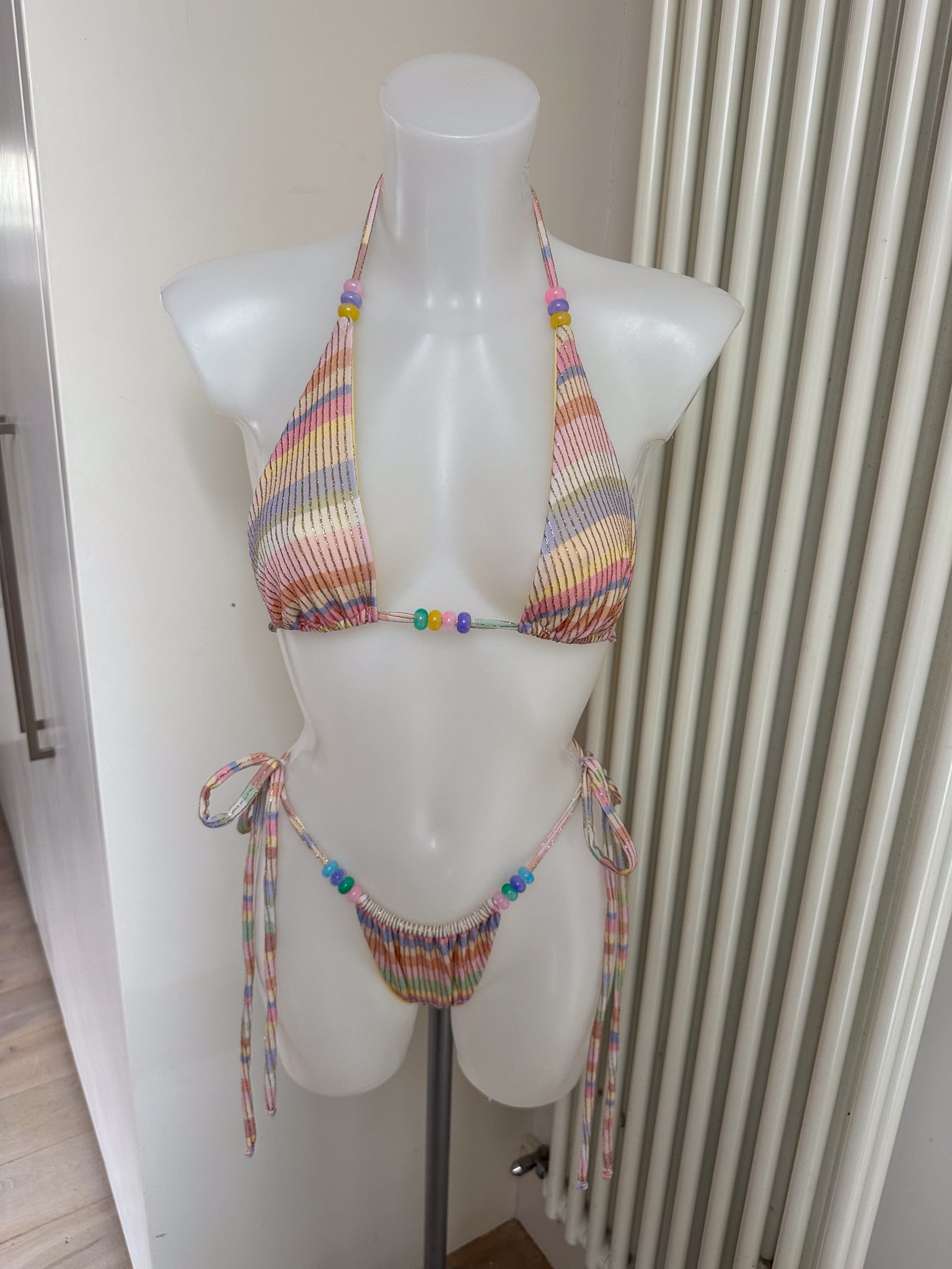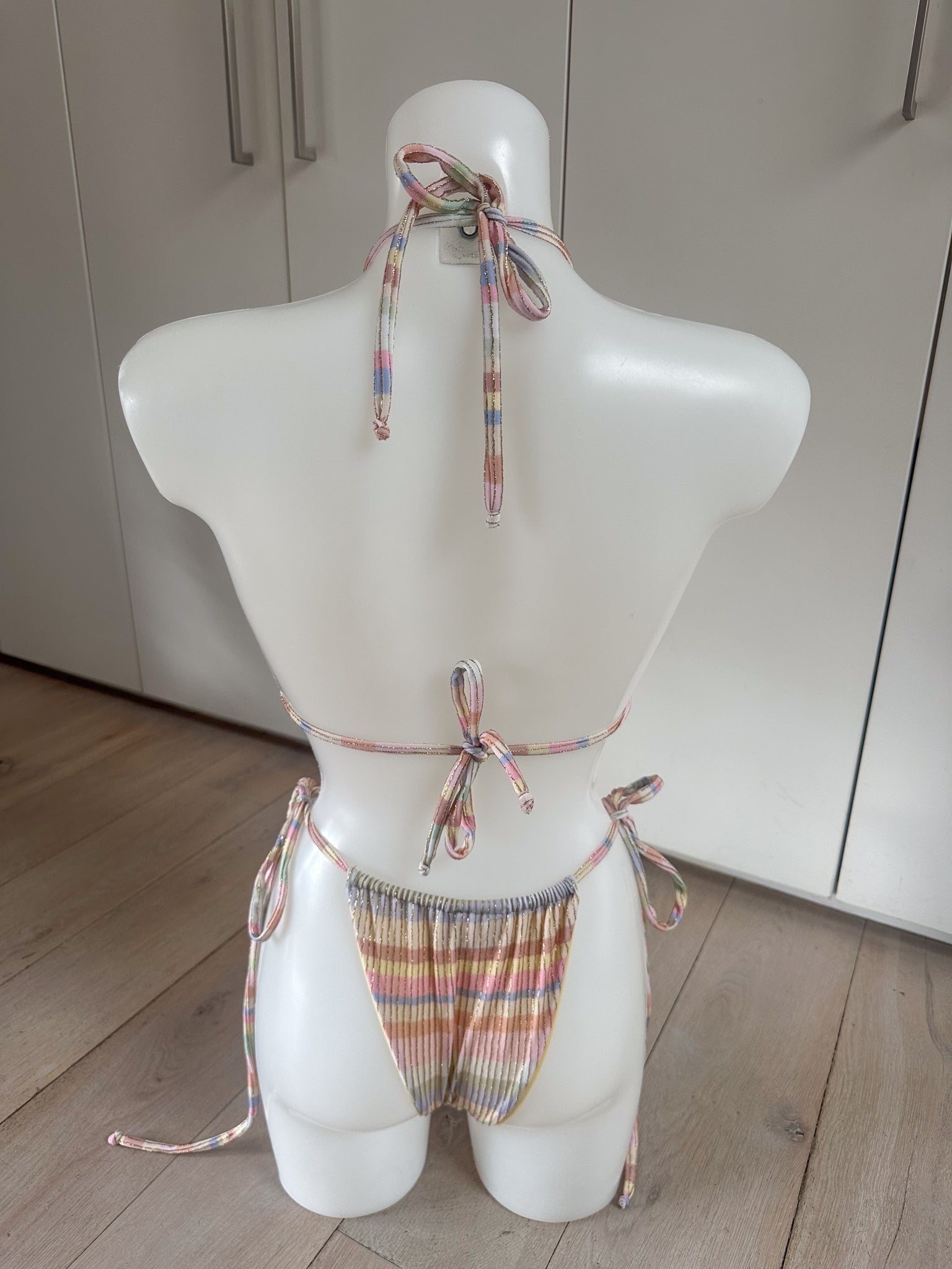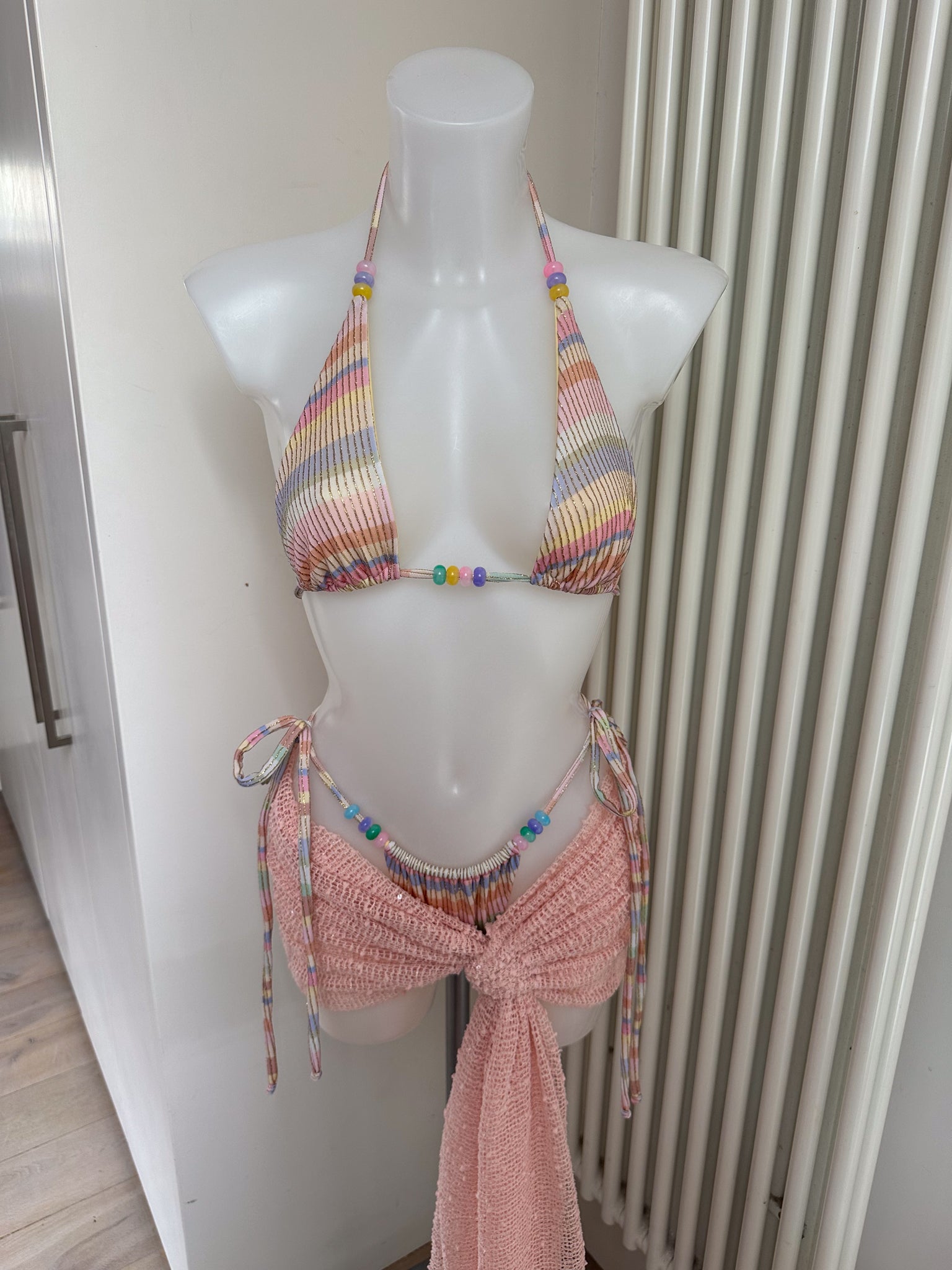 This three piece set features a unique muted pastel stripe print bikini with a metallic gold lurex finish to create a fabric that twinkles in the light, paired with a knitted skirt.