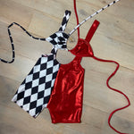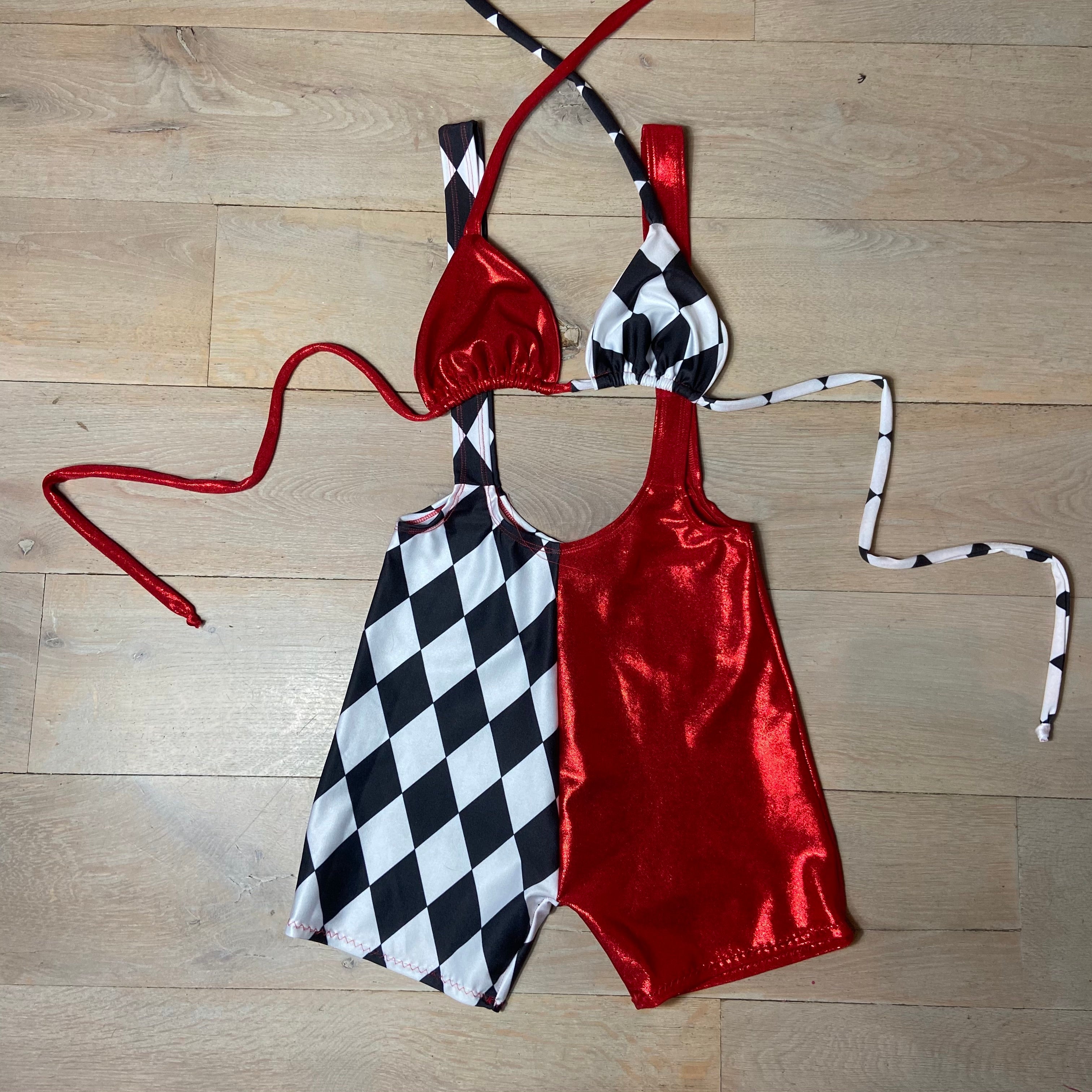 This versatile look that can be styled as a Harlequin, Jester, or Clown. Crafted from striking metallic red, white, and black diamond print fabric.