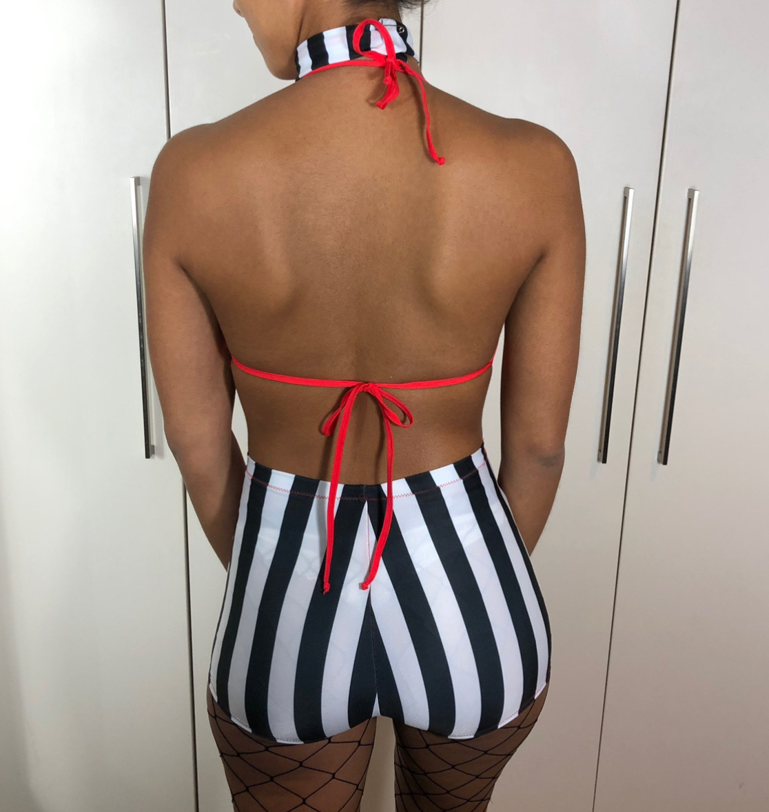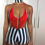 Two piece white and black stripe set with red fringe detail.