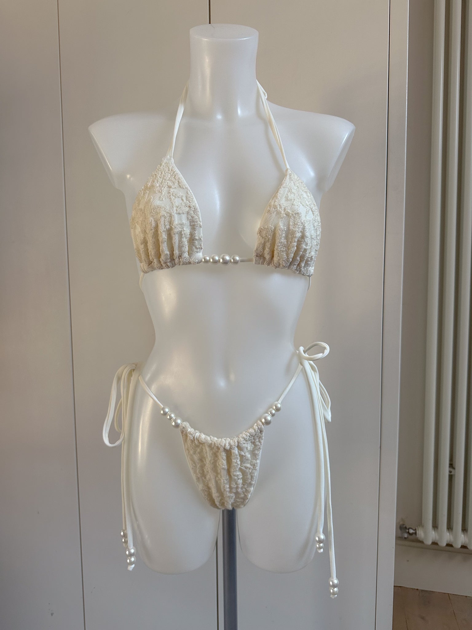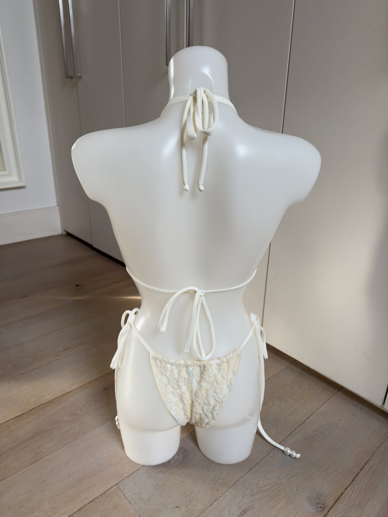 This lace bikini set includes a bikini top and cheeky bikini bottoms, perfect for poolside glam or festival styling.